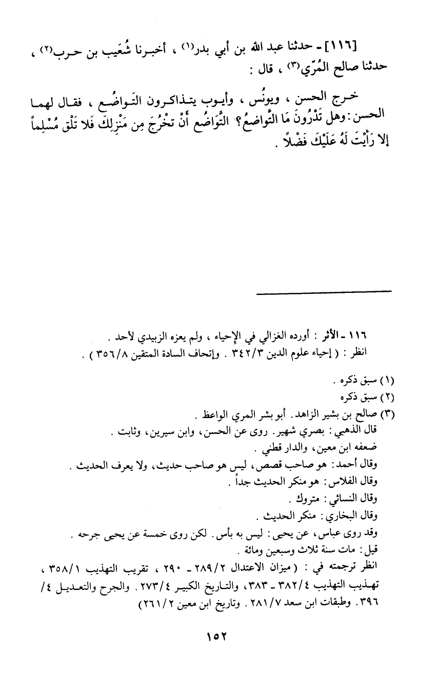 116 - حَدَّثَنَا عَبْدُ اللَّهِ بْنُ أَبِي بَدْرٍ، أَخْبَرَنَا شُعَيْبُ بْنُ حَرْبٍ، حَدَّثَنَا صَالِحٌ الْمُرِّيُّ، قَالَ: خَرَجَ الْحَسَنُ، وَيُونُسُ، وَأَيُّوبُ يَتَذَاكَرُونَ التَّوَاضُعَ فَقَالَ لَهُمُ الْحَسَنُ: «وَهَلْ تَدْرُونَ مَا التَّوَاضُعُ؟ §التَّوَاضُعُ أَنْ تَخْرُجَ مِنْ مَنْزِلِكَ فَلَا تَلْقَ مُسْلِمًا إِلَّا رَأَيْتَ لَهُ عَلَيْكَ فَضْلًا»