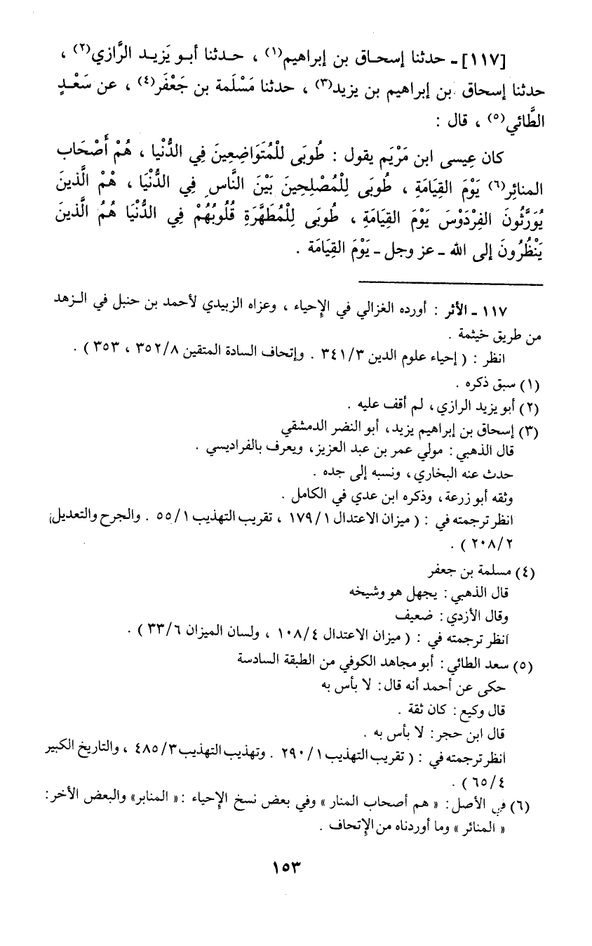 117 - حَدَّثَنَا إِسْحَاقُ بْنُ إِبْرَاهِيمَ، حَدَّثَنَا أَبُو يَزِيدَ الرَّازِيُّ، حَدَّثَنَا إِسْحَاقُ بْنُ إِبْرَاهِيمَ بْنِ يَزِيدَ، حَدَّثَنَا مَسْلَمَةُ بْنُ جَعْفَرٍ، عَنْ سَعْدٍ الطَّائِيِّ، قَالَ: " كَانَ عِيسَى ابْنُ مَرْيَمَ يَقُولُ: §طُوبَى لِلْمُتَوَاضِعِينَ فِي الدُّنْيَا هُمْ أَصْحَابُ الْمَنَائِرِ يَوْمَ الْقِيَامَةِ، طُوبَى لِلْمُصْلِحِينَ بَيْنَ النَّاسِ فِي الدُّنْيَا هُمُ الَّذِينَ يُوَرَّثُونَ الْفِرْدَوْسَ يَوْمَ الْقِيَامَةِ، طُوبَى لِلْمُطَهَّرَةِ قُلُوبُهُمْ فِي الدُّنْيَا هُمُ الَّذِينَ يَنْظُرُونَ إِلَى اللَّهِ عَزَّ وَجَلَّ يَوْمَ الْقِيَامَةِ "