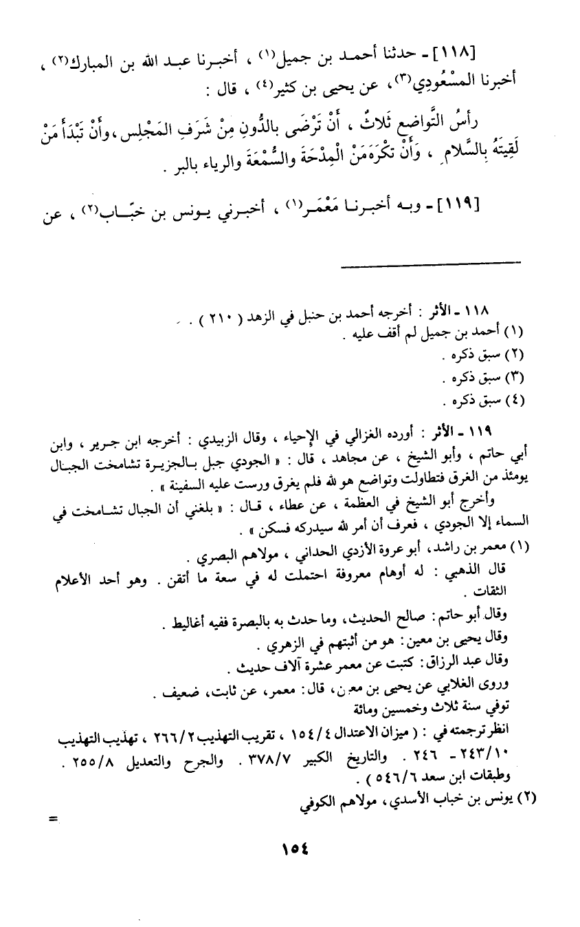 118 - حَدَّثَنَا أَحْمَدُ بْنُ جَمِيلٍ، أَخْبَرَنَا عَبْدُ اللَّهِ بْنُ الْمُبَارَكِ، أَخْبَرَنَا الْمَسْعُودِيُّ، عَنْ يَحْيَى بْنِ كَثِيرٍ قَالَ: «§رَأْسُ التَّوَاضُعِ ثَلَاثٌ أَنْ تَرْضَى بِالدُّونِ مِنْ شَرَفِ الْمَجْلِسِ، وَأَنْ تَبْدَأَ مَنْ لَقِيتَهُ بِالسَّلَامِ، وَأَنْ تَكْرَهَ الْمِدْحَةَ وَالسُّمْعَةَ وَالرِّيَاءَ بِالْبِرِّ»