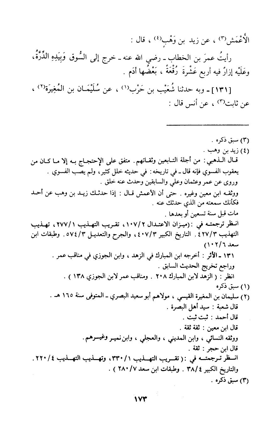 131 - وَبِهِ حَدَّثَنَا شُعَيْبُ بْنُ حَرْبٍ، عَنْ سُلَيْمَانَ بْنِ الْمُغِيرَةِ، عَنْ ثَابِتٍ، عَنْ أَنَسٍ قَالَ: «§رَأَيْتُ بَيْنَ كَتِفَيْ عُمَرَ رَحِمَهُ اللَّهُ أَرْبَعَ رِقَاعٍ»