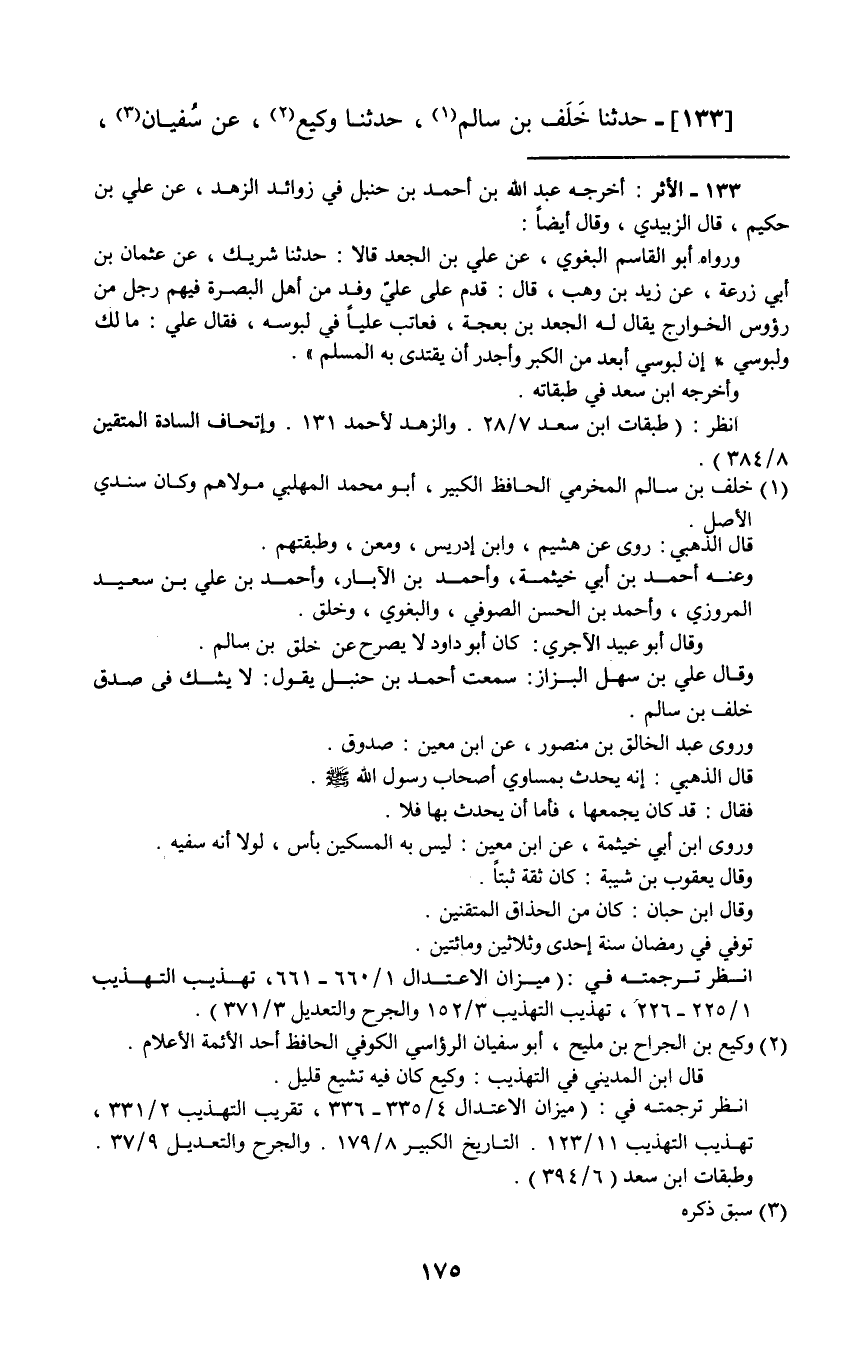 133 - حَدَّثَنَا خَلَفُ بْنُ سَالِمٍ، حَدَّثَنَا وَكِيعٌ، عَنْ سُفْيَانَ، عَنْ عَمْرِو بْنِ قَيْسٍ، أَنَّ عَلِيًّا رَضِيَ اللَّهُ عَنْهُ، رُئِيَ عَلَيْهِ إِزَارٌ مَرْقُوعٌ فَعُوتِبَ فِي لَبُوسِهِ فَقَالَ: «§يَقْتَدِي بِهِ الْمُؤْمِنُ، وَيَخْشَعُ لَهُ الْقَلْبُ»