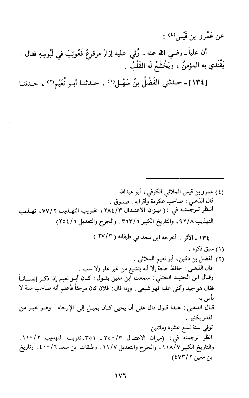 134 - حَدَّثَنِي الْفَضْلُ بْنُ سَهْلٍ، حَدَّثَنَا أَبُو نُعَيْمٍ، حَدَّثَنَا سُفْيَانُ، عَنِ الْأَجْلَحِ، عَنْ عَبْدِ اللَّهِ بْنِ أَبِي الْهُذَيْلِ، قَالَ: «§رَأَيْتُ عَلَى عَلِيِّ بْنِ أَبِي طَالِبٍ رَضِيَ اللَّهُ عَنْهُ قَمِيصًا كَانَ بِدْعًا قَدِيمًا دَارِيًا إِذَا مُدَّ بَلَغَ الظُّفْرَ وَإِذَا أَرْسَلَهُ كَانَ مَعَ نِصْفِ الذِّرَاعِ»