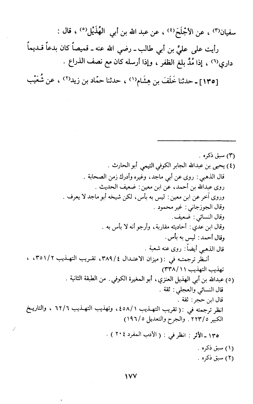 135 - حَدَّثَنَا خَلَفُ بْنُ هِشَامٍ، حَدَّثَنَا حَمَّادُ بْنُ زَيْدٍ، عَنْ شُعَيْبِ بْنِ الْحَبْحَابِ، عَنْ أَبِي سَعِيدٍ رَضِيعِ عَائِشَةَ، قَالَ: " دَخَلْتُ عَلَيْهَا فَرَأَيْتُهَا تَخِيطُ نُقْبَةً لَهَا فَقُلْتُ لَهَا: يَا أُمَّ الْمُؤْمِنِينَ، أَلَيْسَ قَدْ أَوْسَعَ اللَّهُ عَزَّ وَجَلَّ عَلَيْكِ؟ قَالَتْ: «§لَا جَدِيدَ لِمَنْ لَا يَلْبَسُ الْخَلَقَ»
