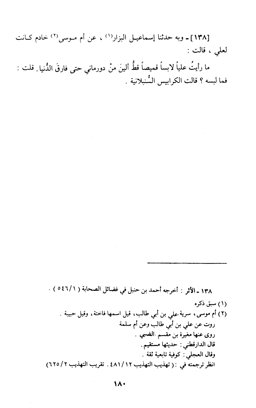 138 - وَبِهِ حَدَّثَنَا إِسْمَاعِيلُ الْبَزَّارُ، عَنْ أُمِّ مُوسَى خَادِمٌ كَانَتْ لِعَلِيٍّ قَالَتْ: «§مَا رَأَيْتُ عَلِيًّا لَابِسًا قَمِيصًا قَطُّ أَلْيَنَ مِنْ دورماني حَتَّى فَارَقَ الدُّنْيَا» قُلْتُ: فَمَا لُبْسُهُ؟ قَالَتِ: «الْكَرَابِيسُ السُّنْبُلَانِيَّةُ»