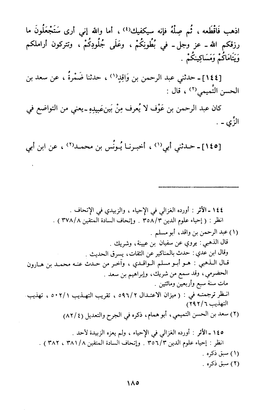 144 - حَدَّثَنِي عَبْدُ الرَّحْمَنِ بْنُ وَاقِدٍ، حَدَّثَنَا ضَمْرَةُ، عَنْ سَعْدِ بْنِ الْحَسَنِ التَّمِيمِيِّ قَالَ: «كَانَ عَبْدُ الرَّحْمَنِ بْنُ عَوْفٍ §لَا يُعْرَفُ مِنْ بَيْنِ عَبِيدِهِ يَعْنِي مِنَ التَّوَاضُعِ فِي الزِّيِّ»