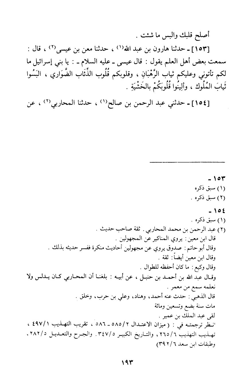 153 - حَدَّثَنَا هَارُونُ بْنُ عَبْدِ اللَّهِ، حَدَّثَنَا مَعْنُ بْنُ عِيسَى قَالَ: سَمِعْتُ بَعْضَ أَهْلِ الْعِلْمِ يَقُولُ: " قَالَ عِيسَى عَلَيْهِ السَّلَامُ: يَا بَنِي إِسْرَائِيلَ مَا لَكُمْ تَأْتُونِي وَعَلَيْكُمْ ثِيَابُ الرُّهْبَانِ وَقُلُوبُكُمْ قُلُوبُ الذِّئَابِ الضَّوَارِي؟ §الْبَسُوا ثِيَابَ الْمُلُوكِ وَأَلِينُوا قُلُوبَكُمْ بِالْخَشْيَةِ "