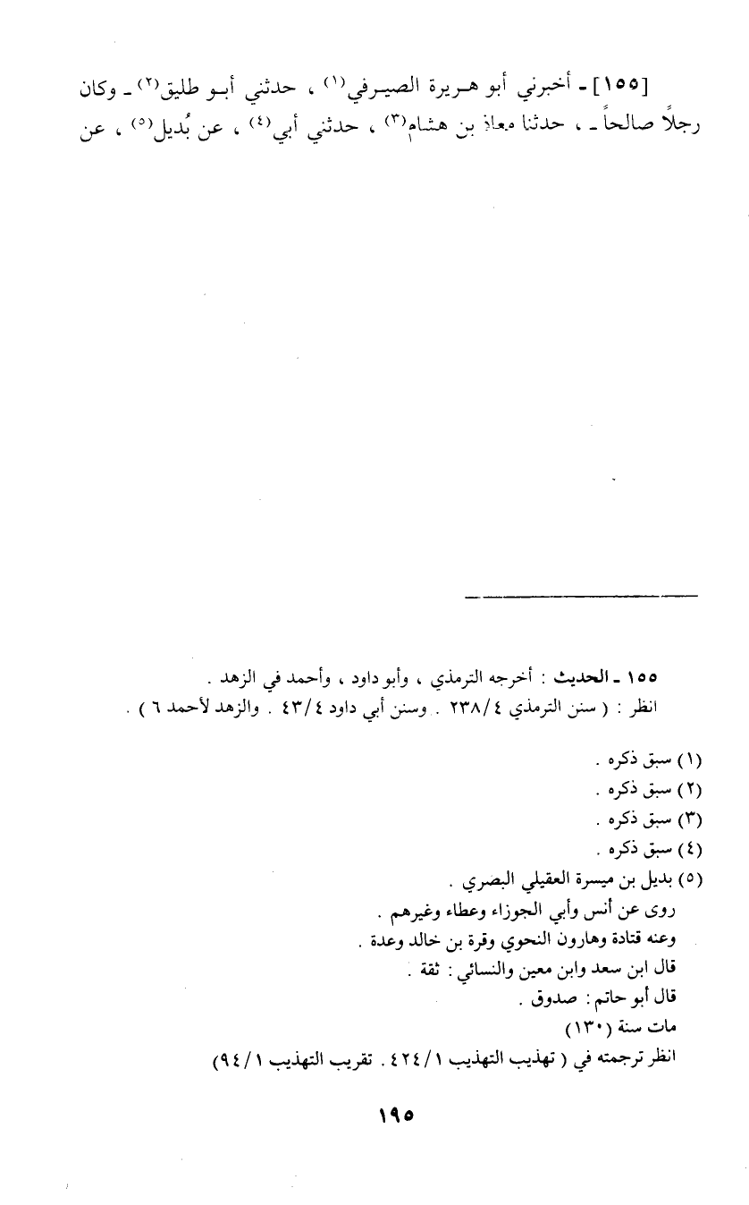 155 - أَخْبَرَنِي أَبُو هُرَيْرَةَ الصَّيْرَفِيُّ، حَدَّثَنِي أَبُو طَلِيقٍ، وَكَانَ رَجُلًا صَالِحًا: حَدَّثَنَا مُعَاذُ بْنُ هِشَامٍ، حَدَّثَنِي أَبِي، عَنْ بُدَيْلٍ، عَنْ -[196]- شَهْرِ بْنِ حَوْشَبٍ، عَنْ أَسْمَاءَ، قَالَتْ: «كَانَ §يَدُ قَمِيصِ النَّبِيِّ صَلَّى اللهُ عَلَيْهِ وَسَلَّمَ إِلَى أَسْفَلَ مِنَ الرُّسْغِ»