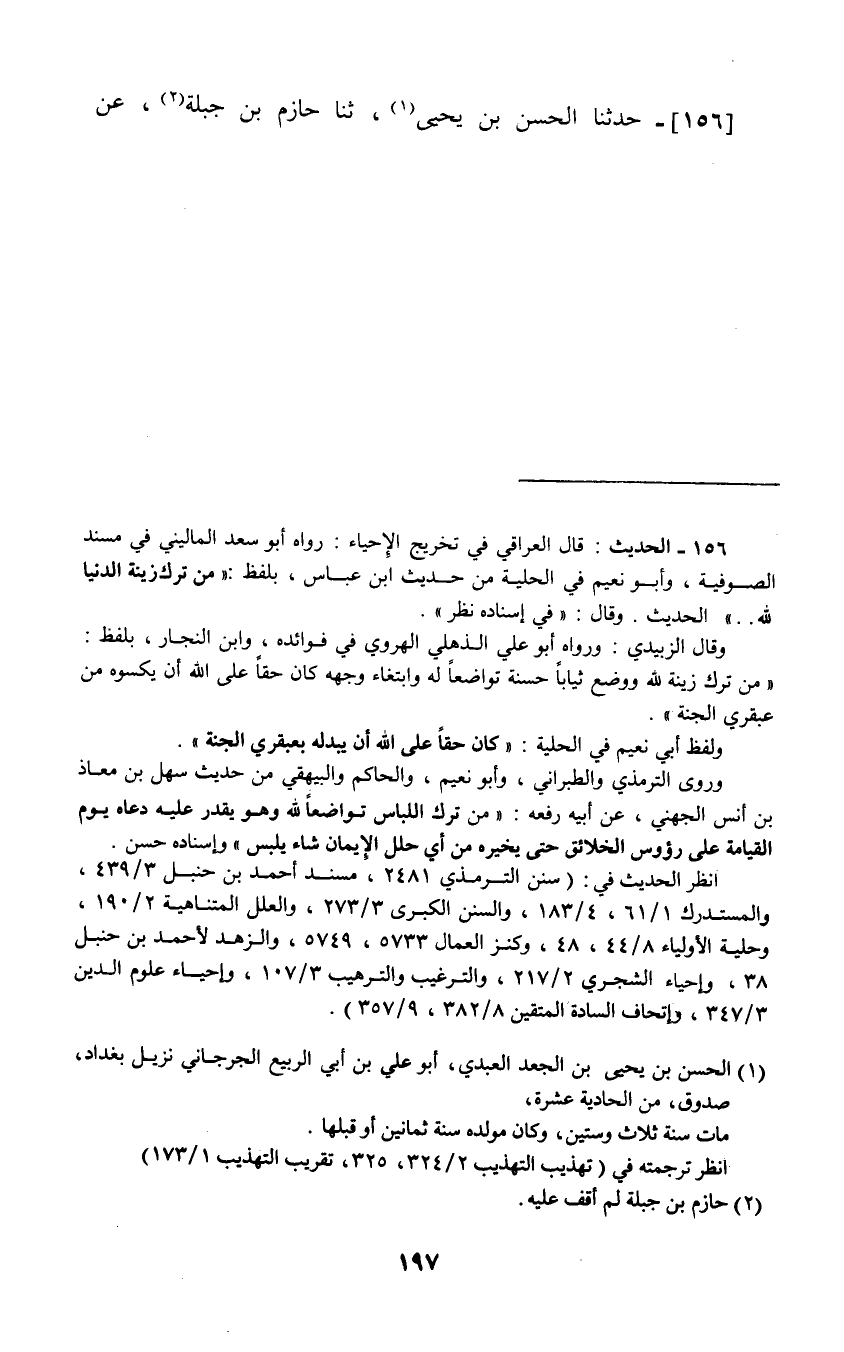 156 - حَدَّثَنَا الْحَسَنُ بْنُ يَحْيَى، ثنا حَازِمُ بْنُ جَبَلَةَ، عَنْ -[198]- إِبْرَاهِيمَ بْنِ أَدْهَمَ، عَنْ إِبْرَاهِيمَ، عَنْ عِكْرِمَةَ، عَنِ ابْنِ عَبَّاسٍ، قَالَ: قَالَ رَسُولُ اللَّهِ صَلَّى اللهُ عَلَيْهِ وَسَلَّمَ: «§مَنْ تَرَكَ زِينَةَ اللَّهِ عَزَّ وَجَلَّ أَوْ وَضَعَ ثِيَابًا حَسَنَةً تَوَاضُعًا لِلَّهِ عَزَّ وَجَلَّ وَابْتِغَاءَ وَجْهِهِ كَانَ حَقًّا عَلَى اللَّهِ عَزَّ وَجَلَّ أَنْ يَدَّخِرَ لَهُ عَبْقَرِيَّ الْجَنَّةِ فِي تِخَاتِ الْيَاقُوتِ»