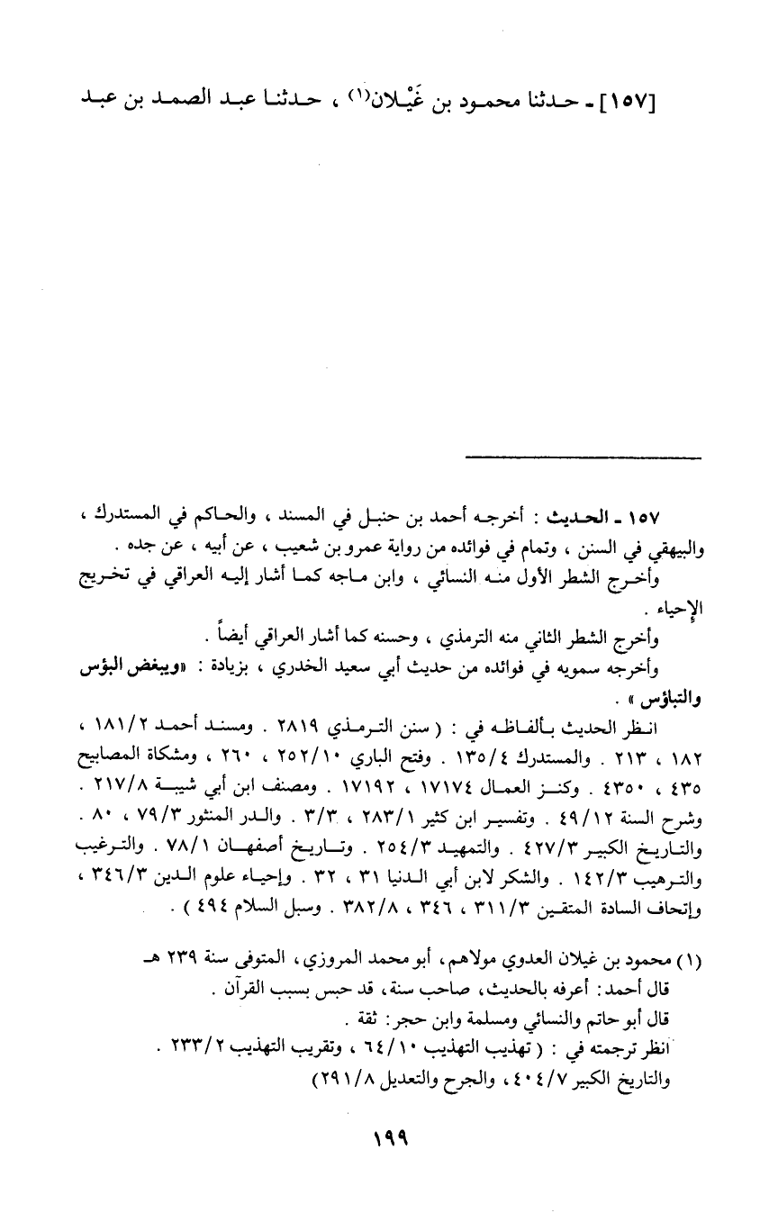 157 - حَدَّثَنَا مَحْمُودُ بْنُ غَيْلَانَ، حَدَّثَنَا عَبْدُ الصَّمَدِ بْنُ عَبْدِ -[200]- الْوَارِثِ، حَدَّثَنَا هَمَّامٌ، عَنْ قَتَادَةَ، عَنْ عَمْرِو بْنِ شُعَيْبٍ، عَنْ أَبِيهِ، عَنْ جَدِّهِ قَالَ: قَالَ رَسُولُ اللَّهِ صَلَّى اللهُ عَلَيْهِ وَسَلَّمَ: «§كُلُوا وَاشْرَبُوا وَالْبَسُوا وَتَصَدَّقُوا فِي غَيْرِ سَرَفٍ وَلَا مَخِيلَةٍ، إِنَّ اللَّهَ يُحِبُّ أَنْ تُرَى أَثَرُ نِعَمِهِ عَلَى عَبْدِهِ»
