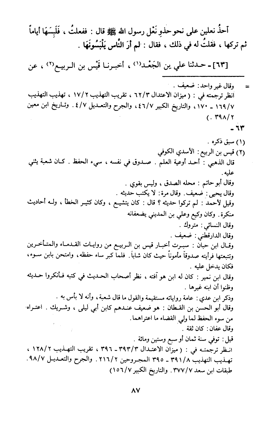 63 - حَدَّثَنَا عَلِيُّ بْنُ الْجَعْدِ، أَخْبَرَنَا قَيْسُ بْنُ الرَّبِيعِ، عَنْ مَنْصُورٍ، عَنْ إِبْرَاهِيمَ قَالَ: «§لَا تَلْبَسْ مِنَ الثِّيَابِ مَا يَشْتَهِرُكَ الْفُقَهَاءُ وَلَا يَزْدَرِيكَ السُّفَهَاءُ»