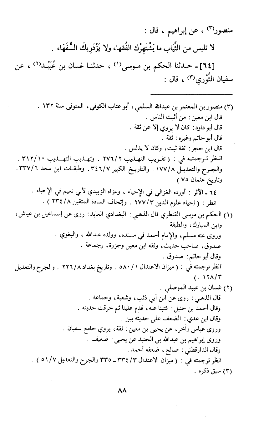 64 - حَدَّثَنَا الْحَكَمُ بْنُ مُوسَى، حَدَّثَنَا غَسَّانُ بْنُ عُبَيْدٍ، عَنْ سُفْيَانَ الثَّوْرِيِّ قَالَ: «كَانُوا §يَكْرَهُونَ الشُّهْرَتَيْنِ الثِّيَابَ الْجِيَادَ الَّتِي يُشْتَهَرُ فِيهَا وَيَرْفَعُ النَّاسُ إِلَيْهِ فِيهَا أَبْصَارَهُمْ، وَالثِّيَابَ الرَّدِيئَةَ الَّتِي يُحْتَقَرُ فِيهَا وَيُسْتَذَلُّ دِينُهُ»