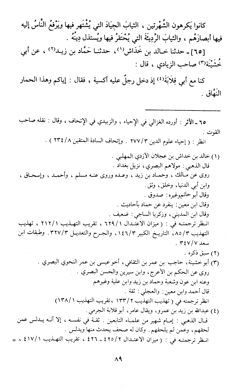 65 - حَدَّثَنَا خَالِدُ بْنُ خِدَاشٍ، حَدَّثَنَا حَمَّادُ بْنُ زَيْدٍ، عَنْ أَبِي خُشَيْنَةَ صَاحِبِ الزِّيَادِيِّ قَالَ: كُنَّا مَعَ أَبِي قِلَابَةَ إِذْ §دَخَلَ رَجُلٌ عَلَيْهِ أَكْسِيَةٌ فَقَالَ: «إِيَّاكُمْ وَهَذَا الْحِمَارَ النَّهَّاقَ»