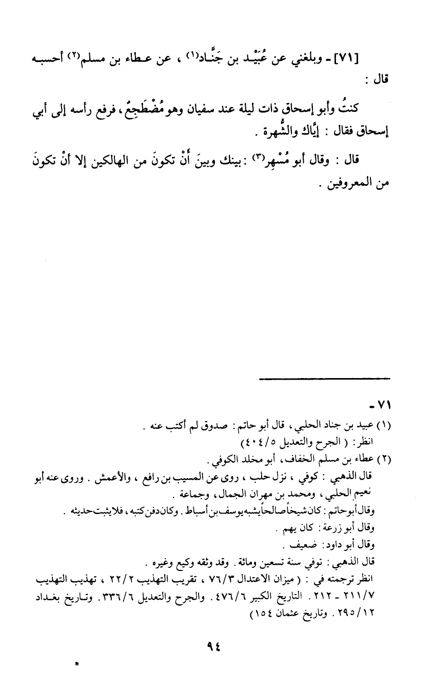 71 - وَبَلَغَنِي عَنْ عُبَيْدِ بْنِ جُنَادٍ، عَنْ عَطَاءِ بْنِ مُسْلِمٍ أَحْسَبُهُ قَالَ: كُنْتُ وَأَبُو إِسْحَاقَ ذَاتَ لَيْلَةٍ عِنْدَ سُفْيَانَ وَهُوَ مُضْطَجِعٌ فَرَفَعَ رَأْسَهُ إِلَى أَبِي إِسْحَاقَ فَقَالَ: «§إِيَّاكَ وَالشُّهْرَةَ» قَالَ: وَقَالَ أَبُو مُسْهِرٍ،: «بَيْنَكَ وَبَيْنَ أَنْ تَكُونَ مِنَ الْهَالِكِينَ إِلَّا أَنْ تَكُونَ مِنَ الْمَعْرُوفِينَ»