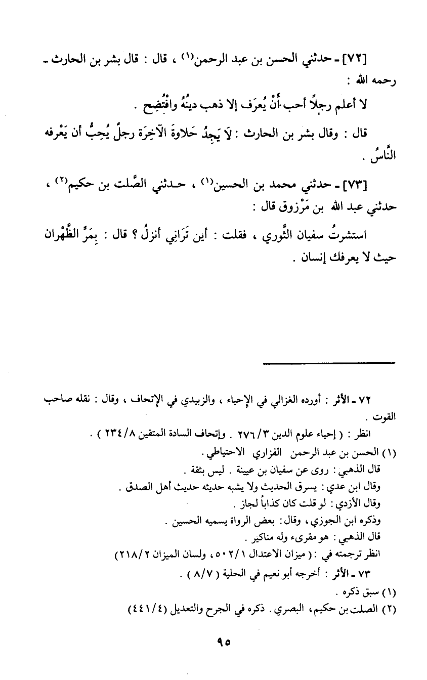 72 - حَدَّثَنِي الْحَسَنُ بْنُ عَبْدِ الرَّحْمَنِ قَالَ: قَالَ بِشْرُ بْنُ الْحَارِثِ رَحِمَهُ اللَّهُ: «§لَا أَعْلَمُ رَجُلًا أَحَبَّ أَنْ يُعْرَفَ إِلَّا ذَهَبَ دِينُهُ وَافْتَضَحَ» قَالَ: وَقَالَ بِشْرُ بْنُ الْحَارِثِ: «لَا يَجِدُ حَلَاوَةَ الْآخِرَةِ رَجُلٌ يُحِبُّ أَنْ يَعْرِفَهُ النَّاسُ»