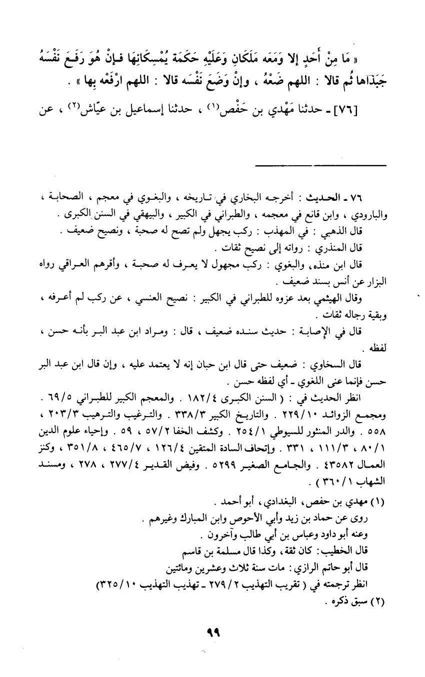 76 - حَدَّثَنَا مَهْدِيُّ بْنُ حَفْصٍ، حَدَّثَنَا إِسْمَاعِيلُ بْنُ عَيَّاشٍ، عَنْ -[100]- مُطْعِمِ بْنِ الْمِقْدَامِ الصَّنْعَانِيِّ، عَنْ عَنْبَسَةَ بْنِ سَعِيدٍ الْكَلَاعِيِّ، عَنْ نَصِيحٍ الْعَنْسِيِّ، عَنْ رَكْبٍ الْمِصْرِيِّ، قَالَ: قَالَ رَسُولُ اللَّهِ صَلَّى اللهُ عَلَيْهِ وَسَلَّمَ: «§طُوبَى لِمَنْ تَوَاضَعَ فِي غَيْرِ مَنْقَصَةٍ، وَذَلَّ مِنْ غَيْرِ مَسْكَنَةٍ وَأَنْفَقَ مَالًا جَمَعَهُ فِي غَيْرِ مَعْصِيَةٍ، وَرَحِمَ أَهْلَ الذُّلِّ وَالْمَسْكَنَةِ، وَخَالَطَ أَهْلَ الْفِقْهِ وَالْحِكْمَةِ»