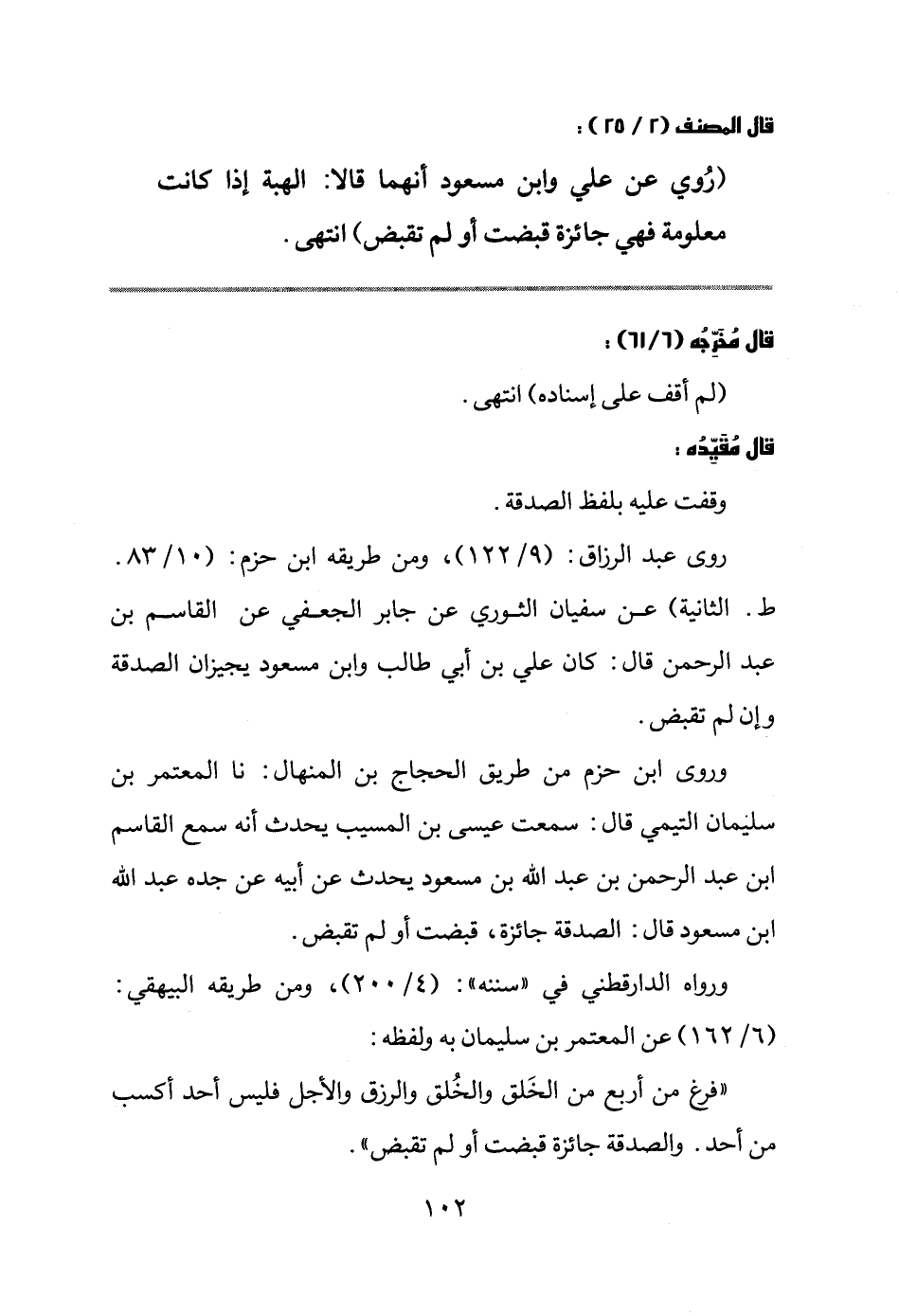 وروى ابن حزم من طريق الحجاج بن المنهال: ثنا المعتمر بن سليمان التيمي قال: سمعت عيسى بن المسيب يحدث أنه سمع القاسم بن عبد الرحمن بن عبد الله بن مسعود يحدث عن أبيه عن جده عبد الله بن مسعود قال: الصدقة جائزة، قبضت أو لم تقبض. ورواه الدارقطني في " سننه ": (4/200) ومن طريقه البيهقي: (6/162) عن المعتمر بن سليمان به ولفظه.