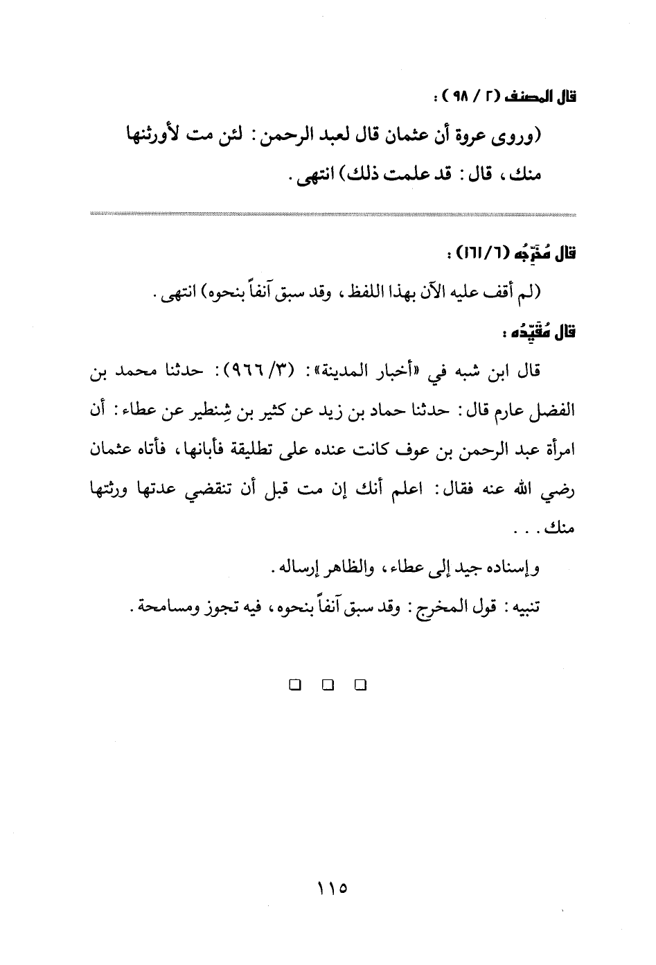 قال ابن شبه في " أخبار المدينة ": (3/966) : حدثنا محمد بن الفضل عارم قال: حدثنا حماد بن زيد عن كثير بن شنطير عن عطاء: أن امرأة عبد الرحمن بن عوف كانت عنده على تطليقة فأبانها، فأتاه عثمان رضي الله عنه فقال: اعلم أنك إن مت قبل أن تنقضي عدتها ورثتها منك ...