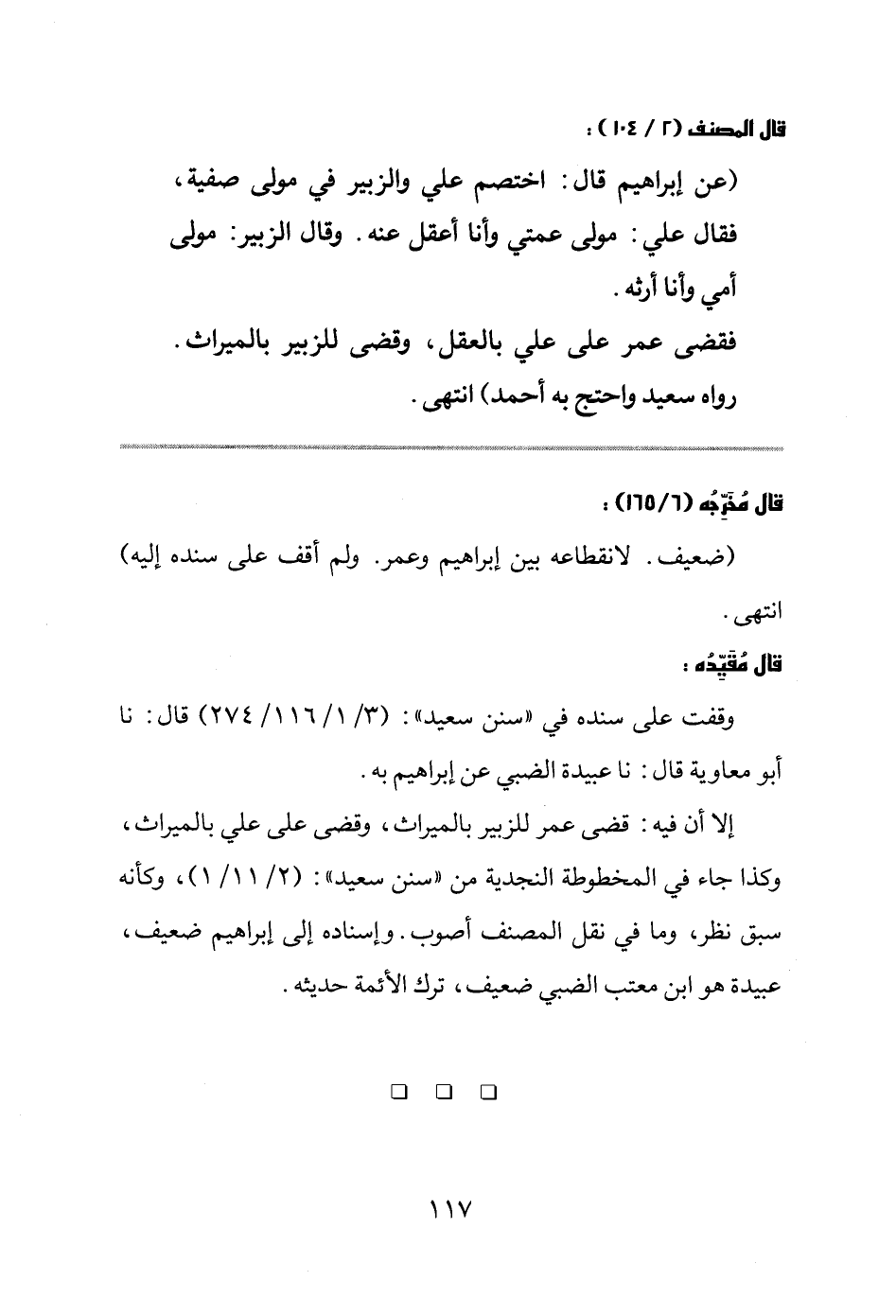 إلا أن فيه: قضى عمر للزبير بالميراث، وقى على علي بالميراث، وكذا جاء في المخطوطة النجدية من " سنن سعيد ": (2/11/1) وكأنه سبق نظر، ومافي نقل المصنف أصوب. وإسناده إلى إبراهيم ضعيف، عبيدة هو ابن معتب الضبي ضعيف، ترك الأئمة حديثه.