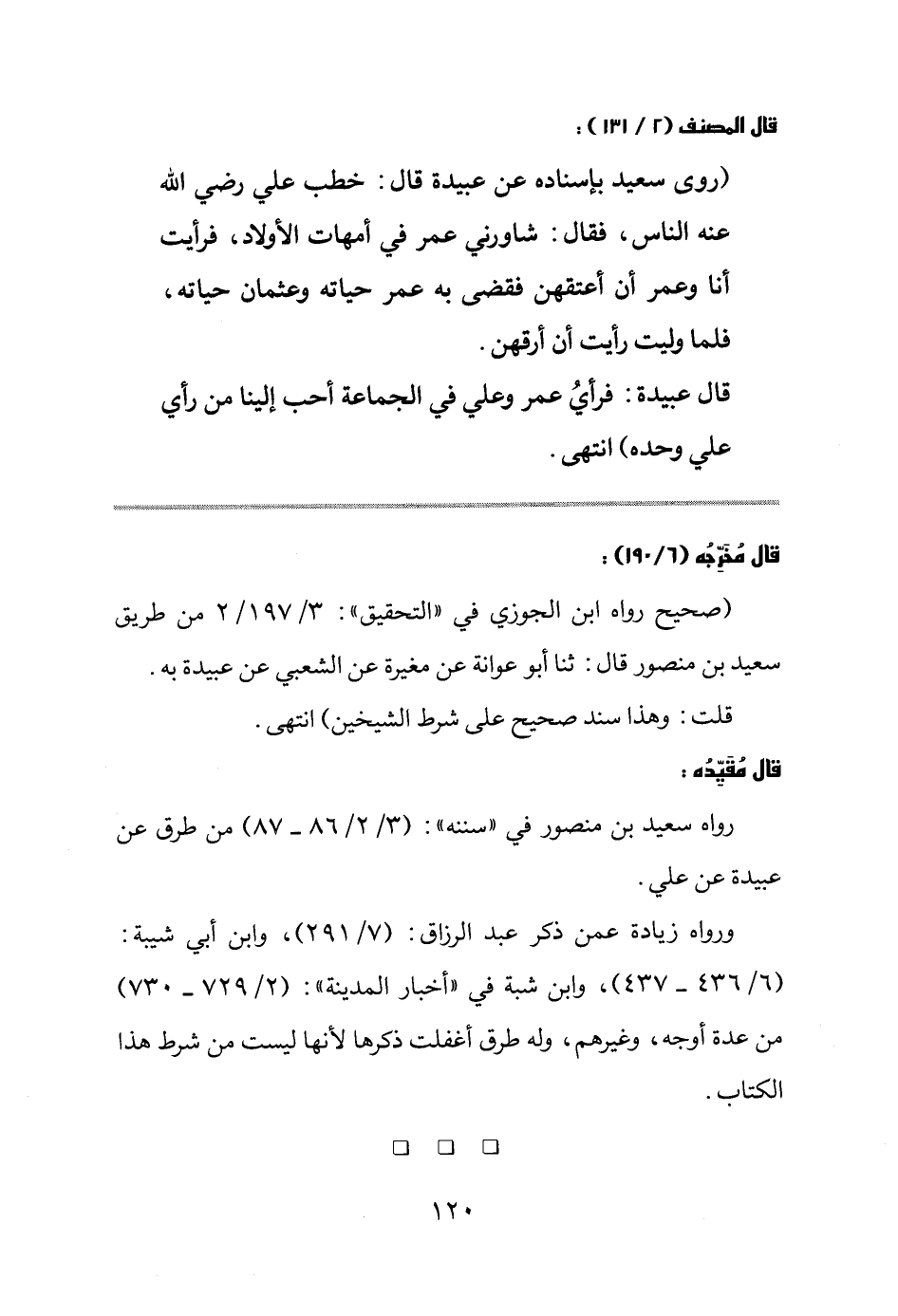 قال عبيدة: فرأيُ عمر وعلي في الجماعة أحب إلينا من رأي علي وحده) انتهى.