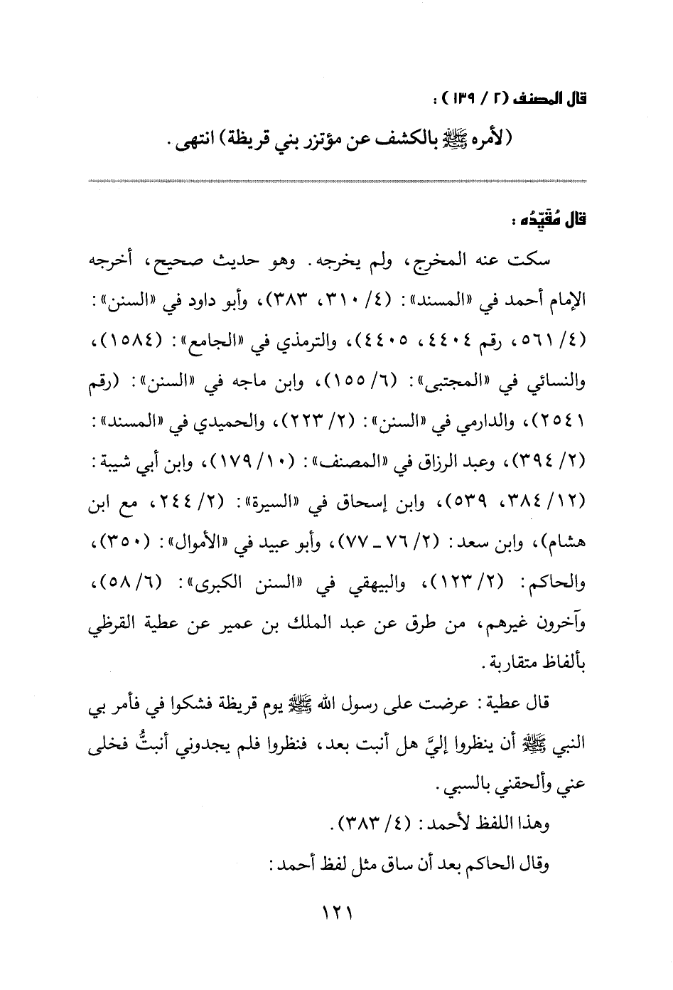 (لأمره صلى الله عليه وسلم بالكشف عن مؤتزر بني قريظة) انتهى.
