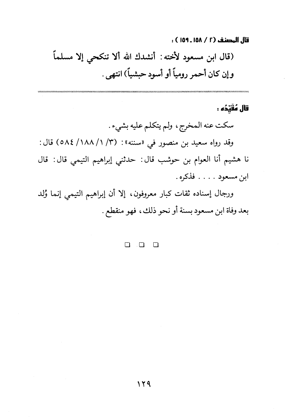 وقد رواه سعيد بن منصور في " سننه ": (3/1/188 / 584) قال: نا هشيم أنا العوام بن حوشب قال: حدثني إبراهيم التيمي قال: قال ابن مسعود ... فذكره.