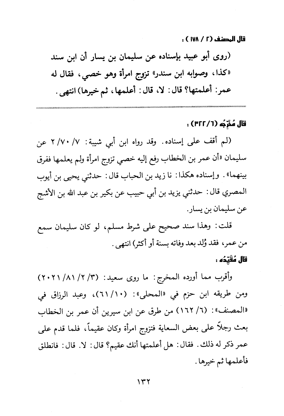 وأقرب مما أورده المخرج: ماروى سعيد: (3/2/81/202) ومن طريقه ابن حزم في " المحلى ": (10/61) وعبد الرزاق في " المصنف ": (6/162) من طرق عن ابن سيرين أن عمر بن الخطاب بعث رجلاً على بعض السعاية فتموج امرأة وكان عقيماً، فلما قدم على عمر ذكر له ذلك. فقال: هل أعلمتها أنك عقيم؟ قال: لا قال: فانطلق فأعلمها ثم خيرها.