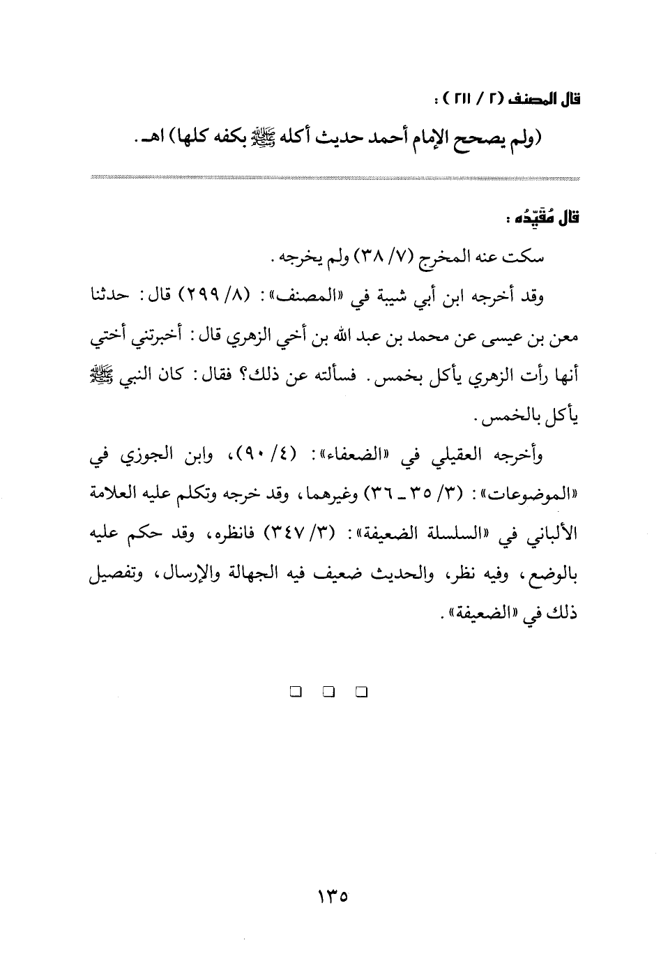 (ولم يصحح الإمام أحمد حديث أكله صلى الله عليه وسلم بكفه كلها) اهـ.