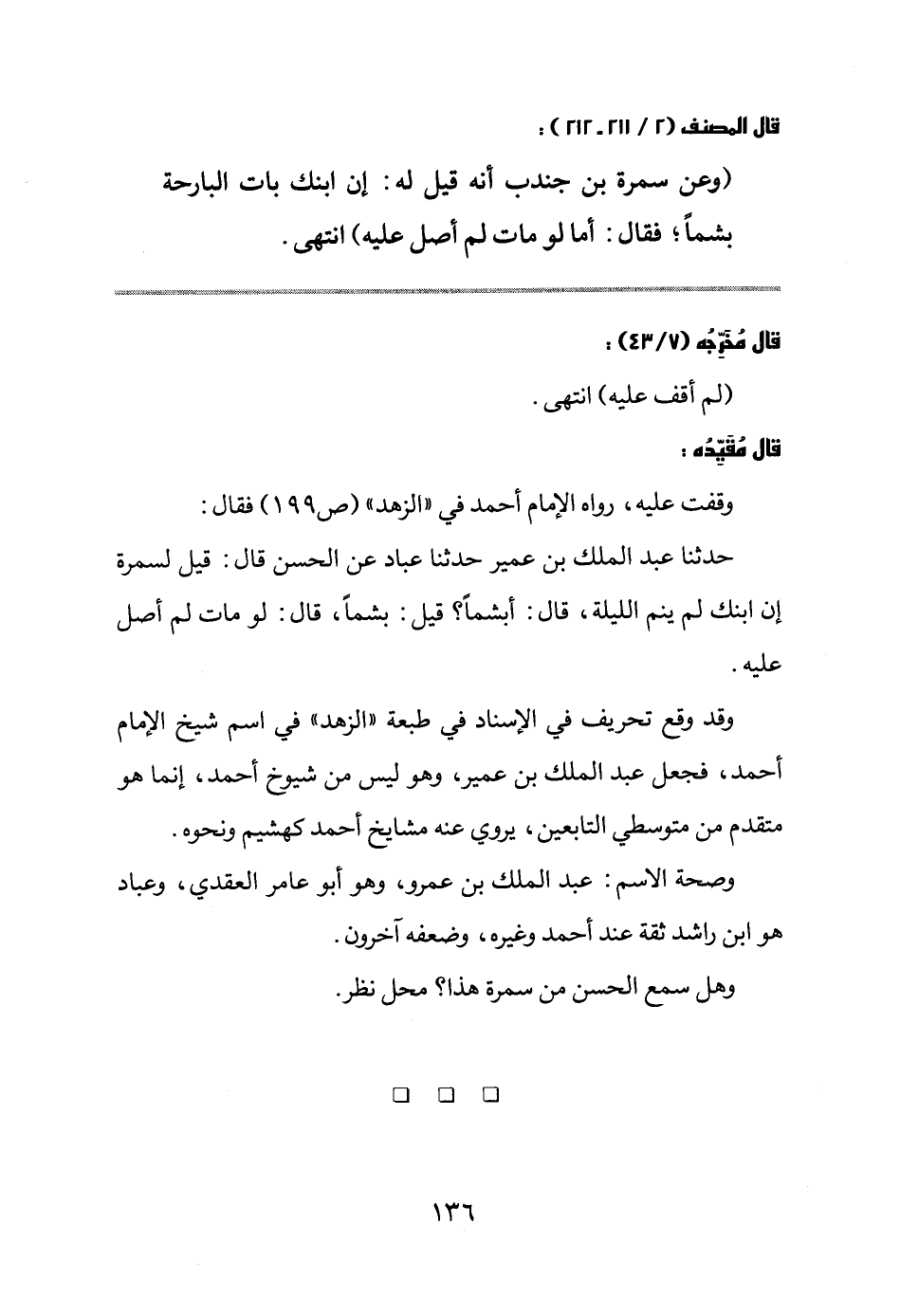 وقفت عليه، رواه الإمام أحمد في " الزهد " (ص199) فقال: حدثنا عبد الملك بن عمير حدثنا عباد عن الحسن قال: قيل لسمرة إن ابنك لم ينم الليلة، قال: أبشماً؟ قيل: بشماً، قال: لومات لم أصل عليه.