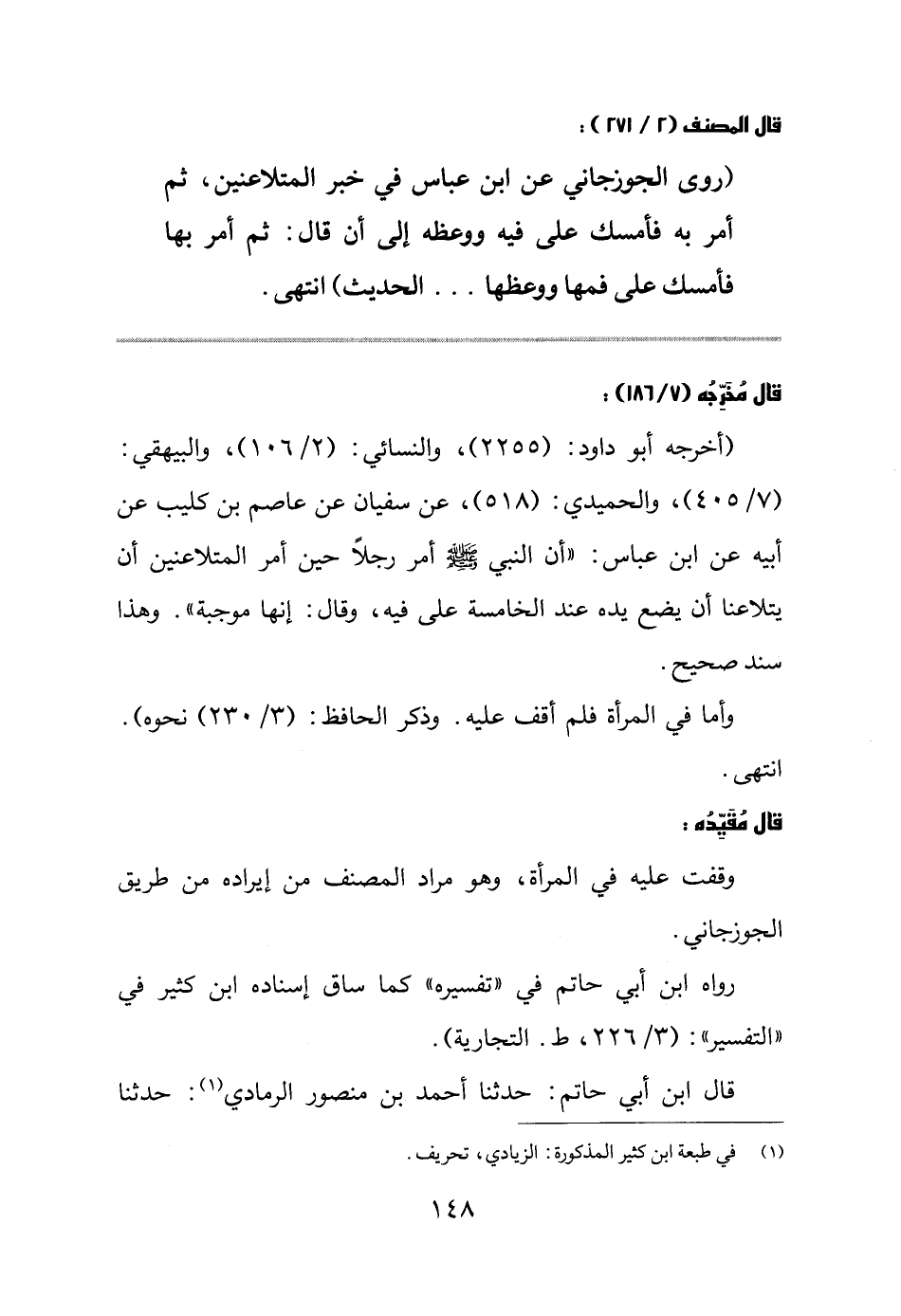 (روى الجوزجاني عن ابن عباس في خبر المتلاعنين، ثم أمر به فأمسك على فيه ووعظه إلى أن قال: ثم أمر بها فأمسك على فمها ووعظها.. الحديث) انتهى.