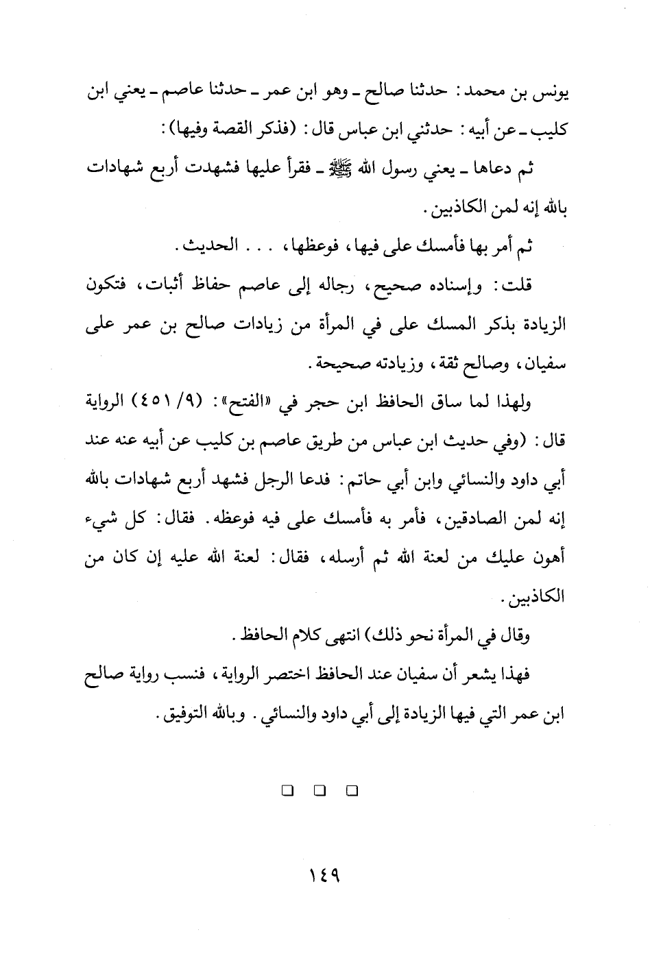 ولهذا لما ساق الحافظ ابن حجر في " الفتح " (9/451) الرواية قال: (وفي حديث ابن عباس من طريق عاصم بن كليب عن أبيه عنه عند أبي داود والنسائي وابن أبي حاتم: فدعا الرجل فشهد أربع شهادات بالله إنه لمن الصادقين، فأمر به فأمسك على فيه فوعظه. فقال: كل شيء أهون عليك من لعنة الله ثم أرسله، فقال: لعنة الله عليه إن كان من الكاذبين.