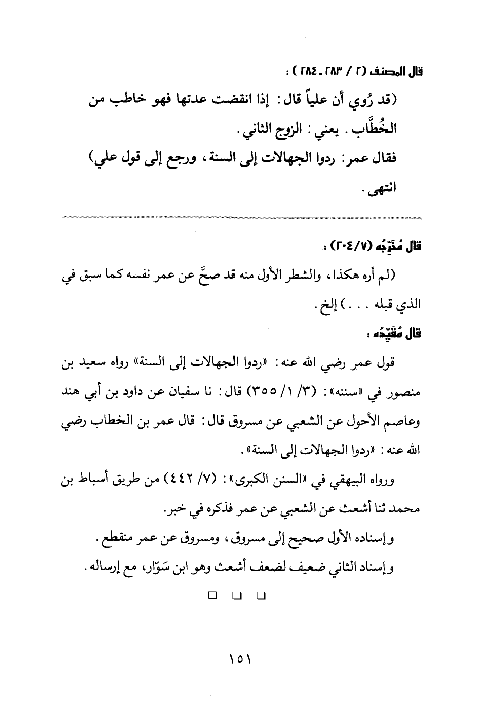 قول عمر رضي الله عنه: " ردوا الجهالات إلى السنة " رواه سعيد بن منصور في " سننه " (3/1/355) قال: نا سفيان عن داود بن أبي هند وعاصم الأحول عن الشعبي عن مسروق قال: قال عمر بن الخطاب رضي الله عنه: " ردوا الجهالات إلى السنة ".
