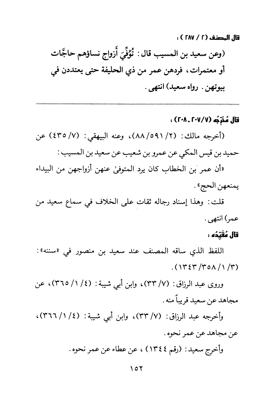 (وعن سعيد بن المسيب قال: تُوُفِّي أزواج نساؤهم حاجّات أو معتمرات، فردهن عمر من ذي الحليفة حتى يعتددن في بيوتهن. رواه سعيد) انتهى.