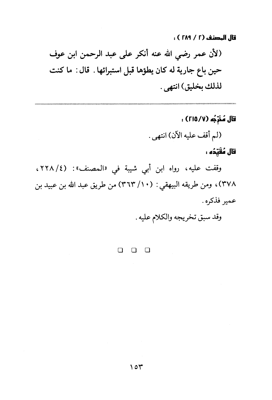 (لأن عمر رضي الله عنه أنكر على عبد الرحمن بن عوف حين باع جارية له كان يطؤها قبل استبرائها قال: ما كنت لذلك بخليق) انتهى.