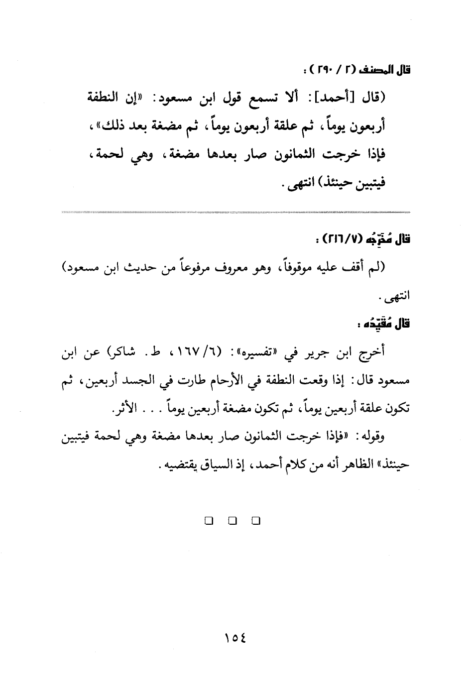 (قال [أحمد] : ألا تسمع قول ابن مسعود: " إن النطفة أربعون يوماً، ثم علقة أربعون يوماً، ثم مضغة بعد ذلك "، فإذا خرجت الثمانون صار بعدها مضغة، وهي لحمة، فيتبين حينئذ) انتهى.