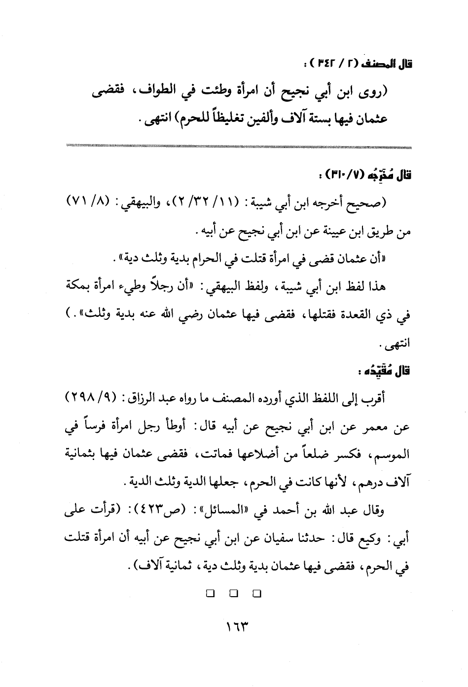 هذا لفظ ابن أبي شيبة، ولفظ البيهقي: " أن رجلاً وطئ امرأة بمكة في ذي القعدة فقتلها , فقضى فيها عثمان رضي الله عنه بدية وثلث ") انتهى.