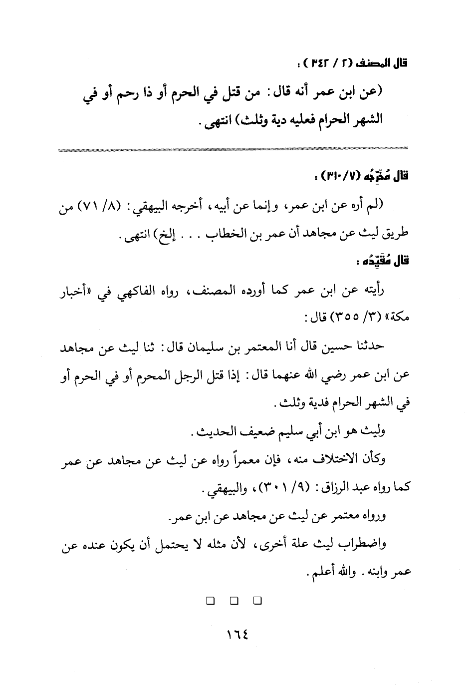 حدثنا حسين قال أنا المعتمر بن سليمان قال: ثنا ليث عن مجاهد عن ابن عمر رضي الله عنهما قال: إذا قتل الرجل المحرم أوفي الحرم أو في الشهر الحرام فدية وثلث.