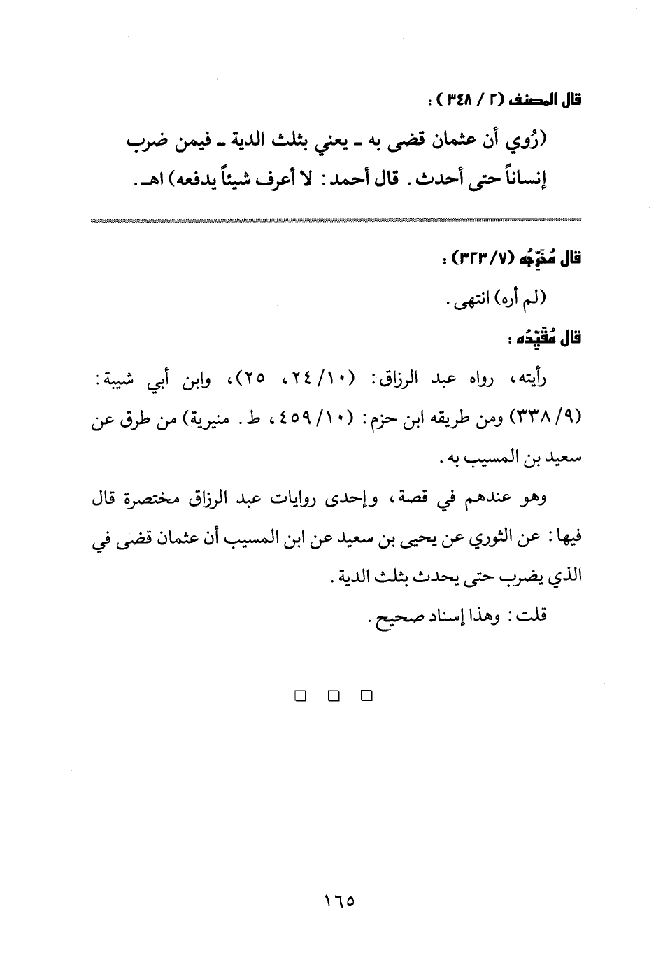 وهو عندهم في قصة، وإحدى روايات عبد الرزاق مختصرة قال فيها: عن الثوري عن يحيى بن سعيد عن ابن المسيب أن عثمان قضى في الذي يضرب حتى يحدث بثلث الدية.