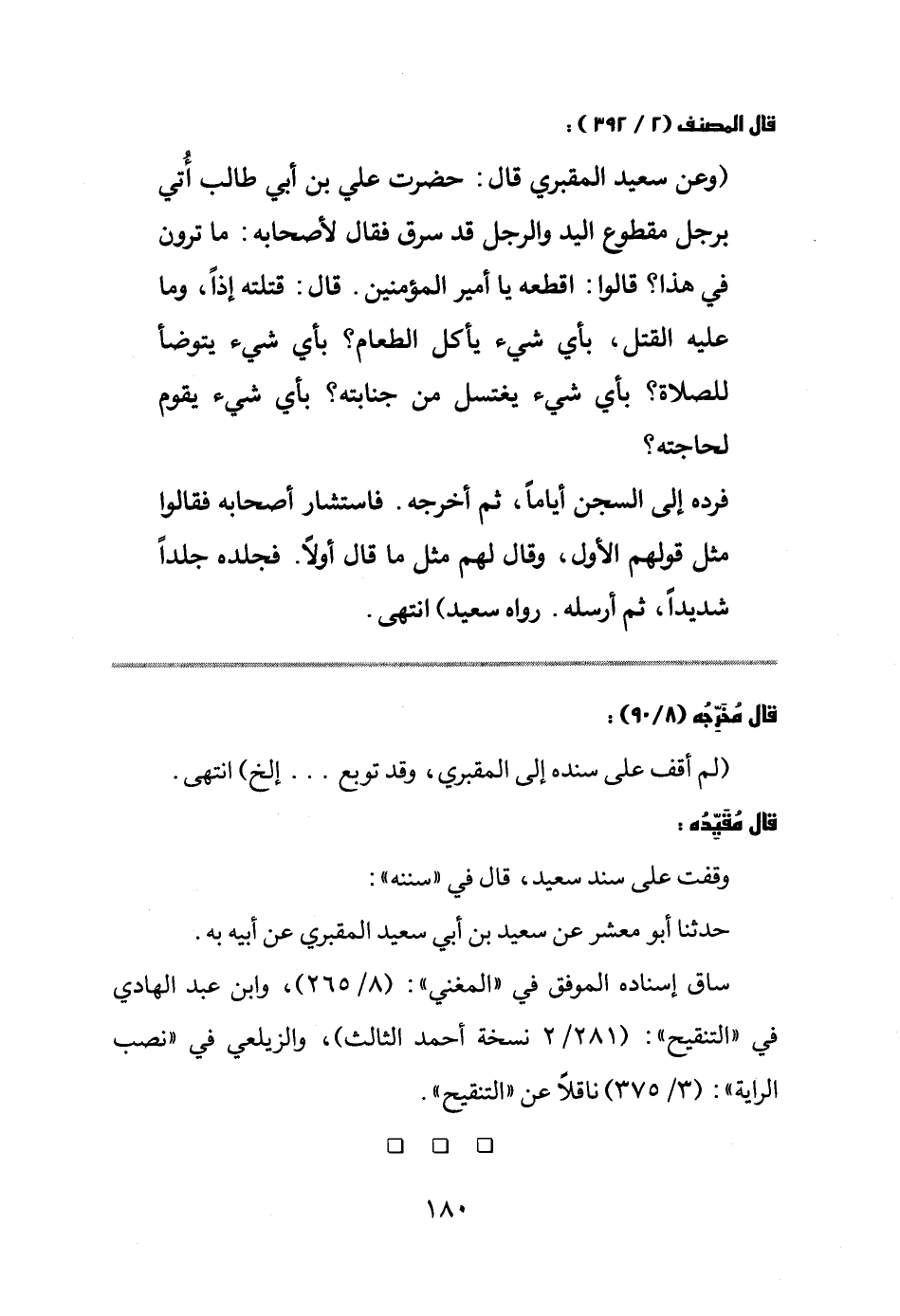 (وعن سعيد المقبري قال: حضرت علي بن أبي طالب أُتي برجل مقطوع اليد والرجل قد سرق فقال لأصحابه: ماترون في هذا؟ قالوا: اقطعه يا أمير المؤمنين. قال: قتلته إذاّ، وما عليه القتل، بأي شيء يأكل الطعام؟ بأي شيء يتوضأ للصلاة؟ بأي شيء يغتسل من جنابته؟ بأي شيء يقوم لحاجته؟