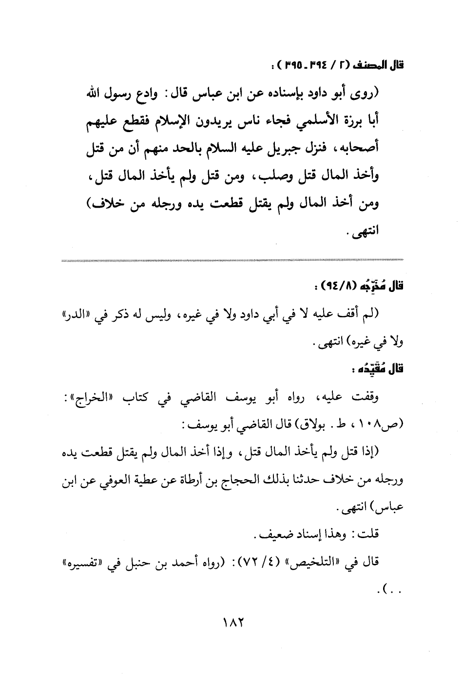 (روى أبو داود بإسناده عن ابن عباس قال: وادع رسول الله أبا برزة الأسلمي فجاء ناس يريدون الإسلام فقطع عليهم أصحابه، فنزل جبريل عليه السلام بالحد منهم أن من قتل وأخذ المال قتل وصلب، ومن قتل ولم يأخذ المال قتل، ومن أخذ المال ولم يقتل قطعت يده ورجله من خلاف) انتهى.