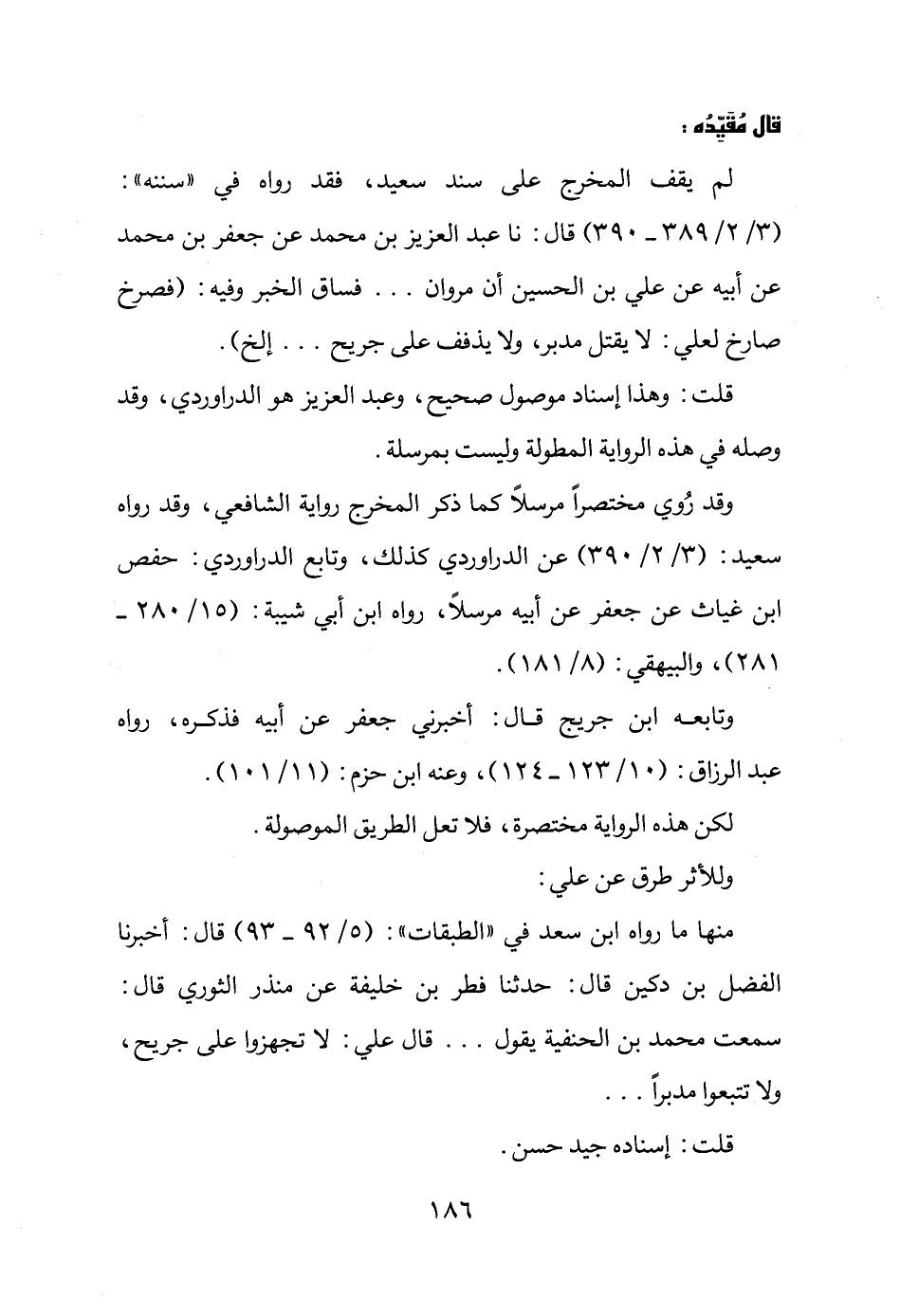 منها مارواه ابن سعد في " الطبقات " (5/92 ـ 93) قال: أخبرنا الفضل بن دكين قال: حدثنا فطر بن خليفة عن منذر الثوري قال: سمعت محمد بن الحنفية يقول ... قال علي: لا تجهزوا على جريح، ولا تتبعوا مدبراً ...