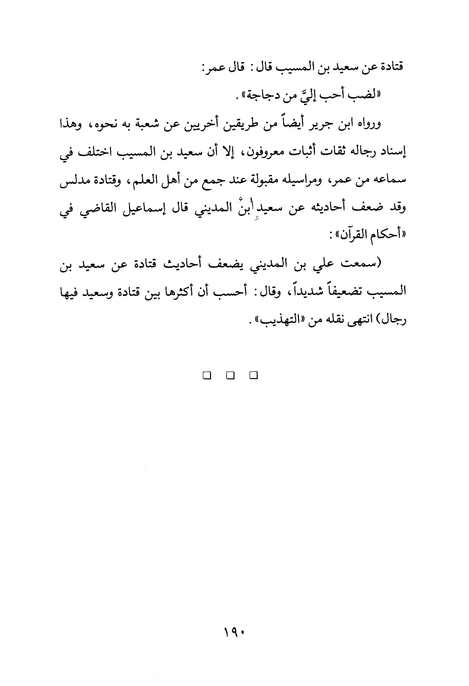 ورواه ابن جرير أيضاً من طريقين أخريين عن شعبة به نحوه، وهذا إسناد رجاله ثقات أثبات معروفون، إلا أن سعيد بن المسب اختلف في سماعه من عمر، ومراسيله مقبولة عند جمع من أهل العلم، وقتادة مدلس وقد ضعف أحاديثه عن سعيد بن المديني قال إسماعيل القاضي في " أحكام القرآن ".
