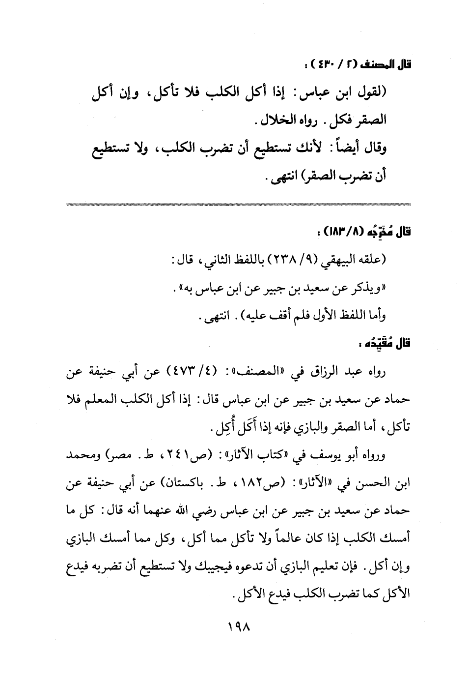 ورواه أبو يوسف في " كتاب الآثار" (ص241، ط مصر) ومحمد بن الحسن في " الآثار " (ص182، ط باكستان) عن أبي حنيفة عن حماد عن سعيد بن جبير عن ابن عباس رضي الله عنهما أنه قال: كل ماأمسك الكلب إذا كان عالماً ولا تأكل مما أكل وكل مما أمسك البازي وإن أكل. فإن تعليم البازي أن تدعوه فيجيبك ولا تستطيع أن تضربه فيدع الأكل كما تضرب الكلب فيدع الأكل.
