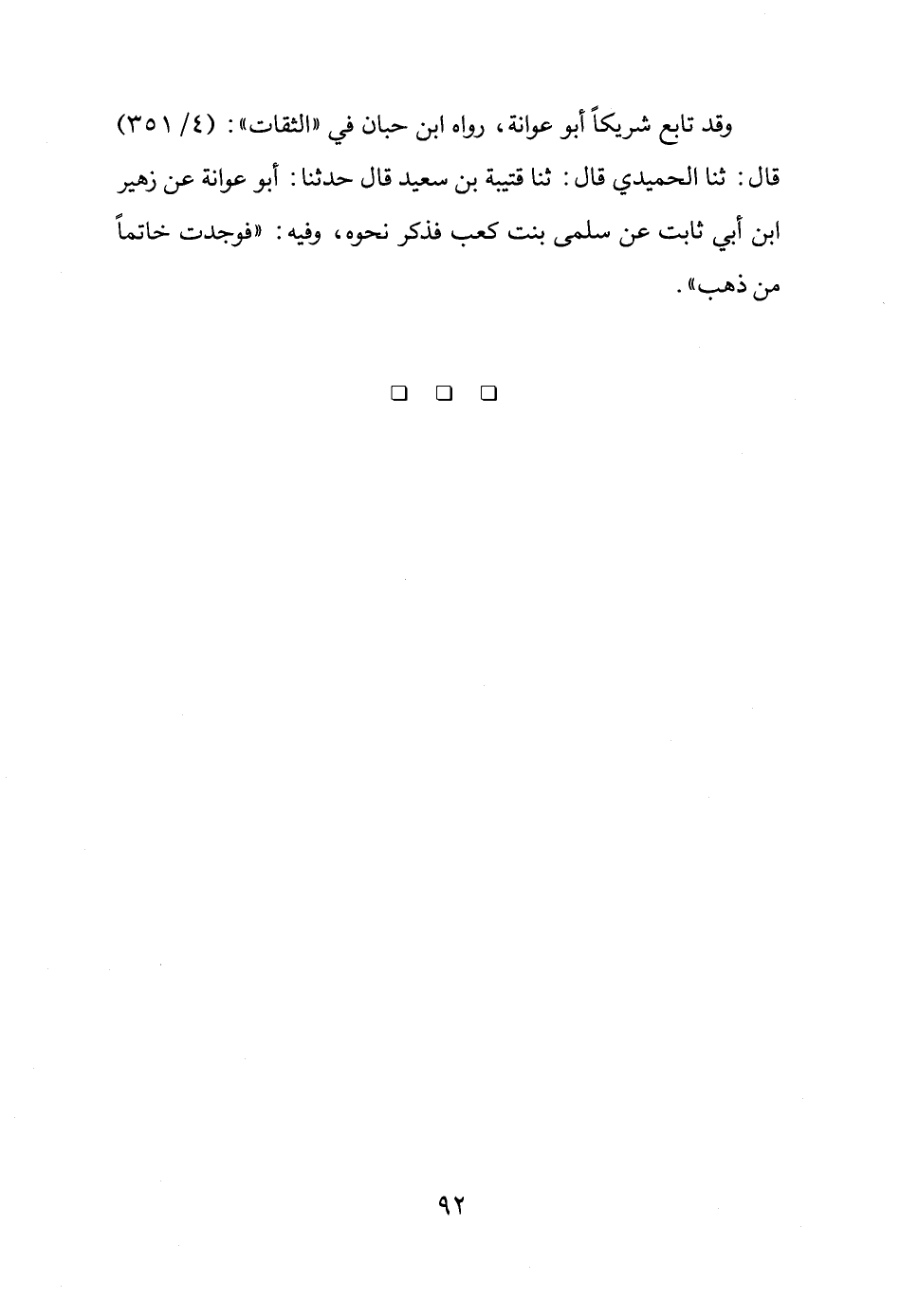 وقد تابع شريكاً أبو عوانة، رواه ابن حبان في " الثقات " (4/351) قال: ثنا الحميدي قال: ثنا قتيبة بن سعيد قال حدثنا: أبو عوانة عن زهير بن أبي ثابت عن سلمى بنت كعب فذكر نحوه، وفيه: " فوجدت خاتماً من ذهب ".