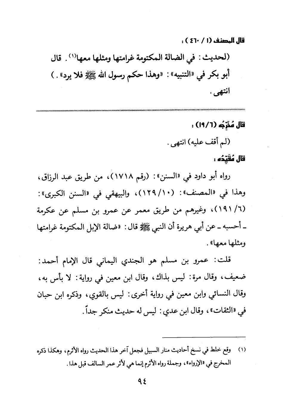 (لحديث: في الضالة المكتومة غرامتها ومثلها معها (1) قال ابو بكر في " التنبيه ": " وهذا حكم رسول الله صلى الله عليه وسلم فلا يرد ") .