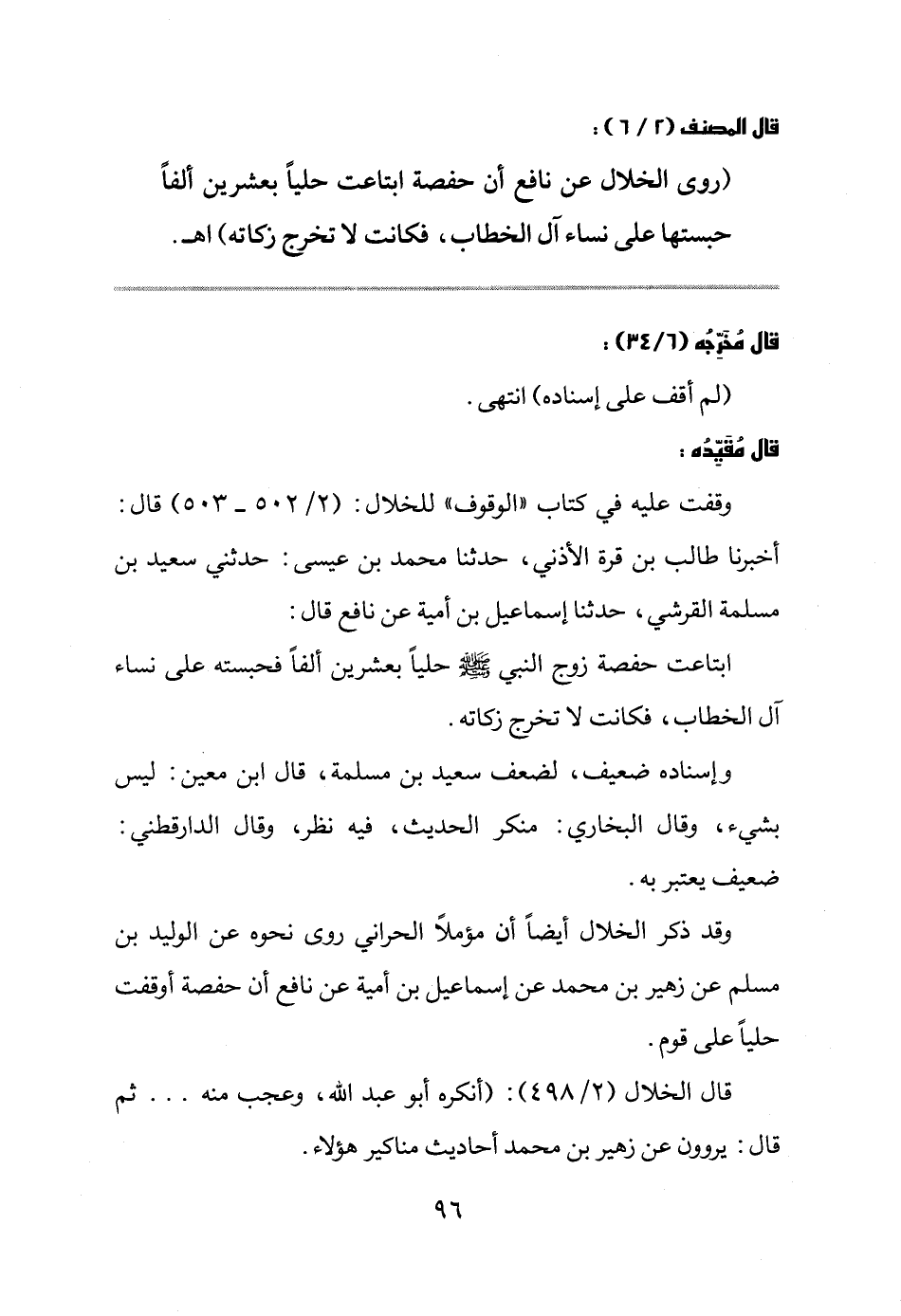 وقد ذكر الخلال أيضاً أن مؤملاً الحراني روى نحوه عن الوليد بن مسلم عن زهير بن محمد عن إسماعيل بن أمية عن نافع أن حفصة أوقفت حلياً على قرم.