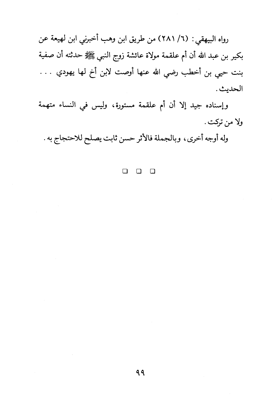 رواه البيهقي: (6/281) من طريق ابن وهب أخبرني ابن لهيعة عن بكير بن عبد الله أن أم علقمة مولاة عائشة زوج النبي صلى الله عليه وسلم حدثته أن صفية بنت حيي بن أخطب رضي الله عنها أوصت لابن أخ لها يهودي ... الحديث.