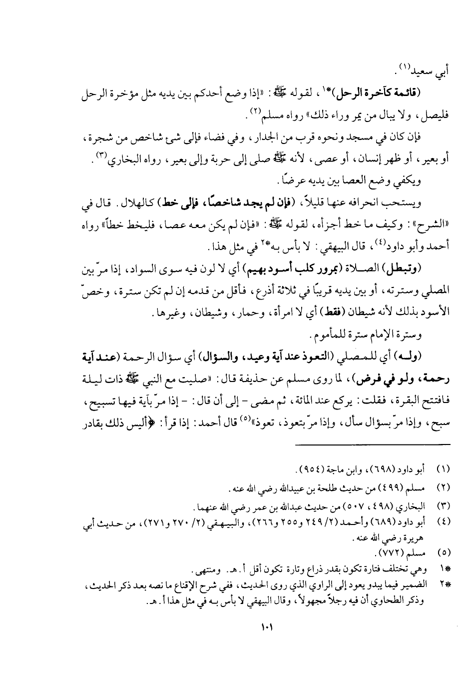 أبي سعيد (قائمة كمؤخرة الرحل) ؛ لقوله - صَلَّى اللَّهُ عَلَيْهِ وَسَلَّمَ -: «إذا وضع أحدكم بين يديه مثل مؤخرة الرحل فليصل، ولا يبال من يمر وراء ذلك» ، رواه مسلم، فإن كان في مسجد ونحوه قرب من الجدار وفي فضاء فإلى شيء شاخص من شجر، أو بعير، أو ظهر إنسان، أو عصى؛ «لأنه - صَلَّى اللَّهُ عَلَيْهِ وَسَلَّمَ - صلى إلى حربة وإلى بعير» ، رواه البخاري ويكفي وضع العصا بين يديه عرضا،