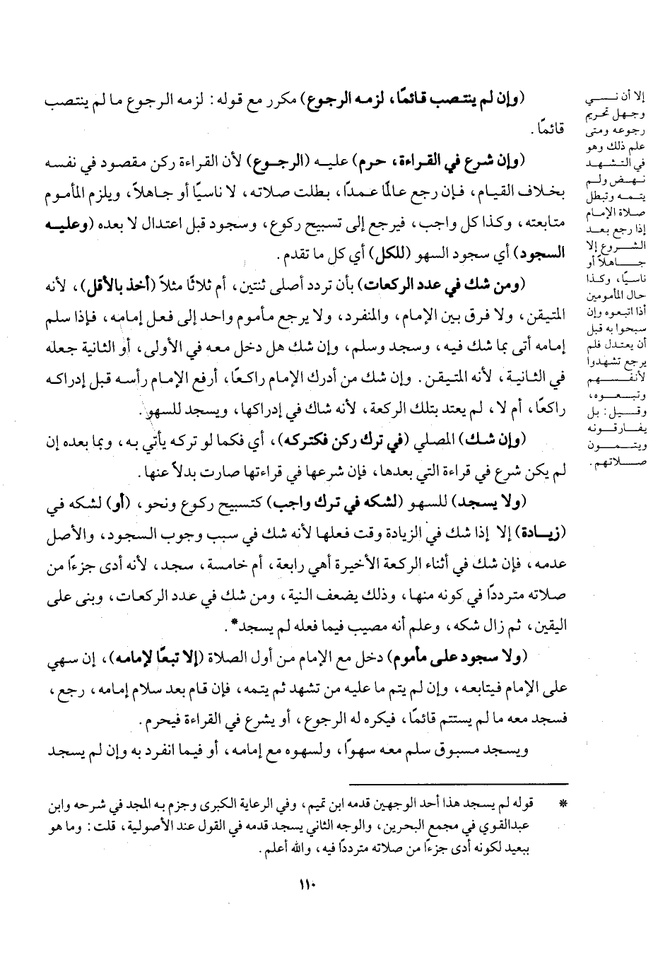 (وإن لم ينتصب قائما لزمه الرجوع) مكرر مع قوله: لزمه الرجوع ما لم ينتصب قائما، (وإن شرع في القراءة حرم) عليه (الرجوع) ؛ لأن القراءة ركن مقصود في نفسه بخلاف القيام، فإن رجع عالما عمدا بطلت صلاته لا ناسيا، أو جاهلا ويلزم المأموم متابعته، وكذا كل واجب فيرجع إلى تسبيح ركوع وسجود قبل اعتدال لا بعده (وعليه السجود) أي سجود السهو (للكل) أي كل ما تقدم.