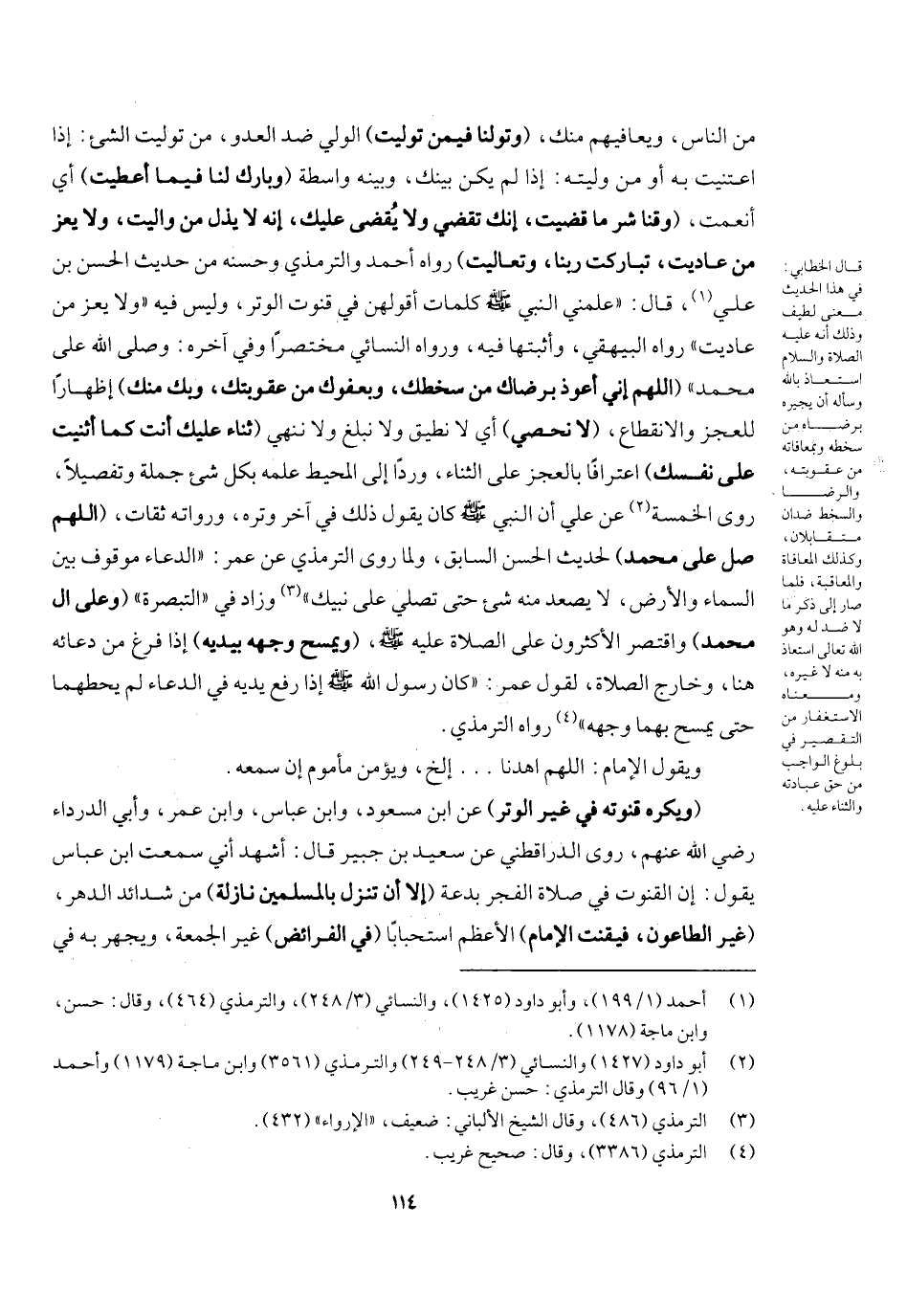 من الناس ويعافيهم منك، «وتولني فيمن توليت» الولي ضد العدو من توليت الشيء: إذا اعتنيت به، أو من وليته: إذا لم يكن بينك وبينه واسطة «وبارك لنا فيما أعطيت» أي أنعمت «وقني شر ما قضيت إنك تقضي، ولا يقضى عليك، إنه لا يذل من واليت، ولا يعز من عاديت، تباركت ربنا وتعاليت» ، رواه أحمد والترمذي وحسنه من حديث الحسن بن علي، قال: «علمني النبي - صَلَّى اللَّهُ عَلَيْهِ وَسَلَّمَ - كلامات أقولهن
