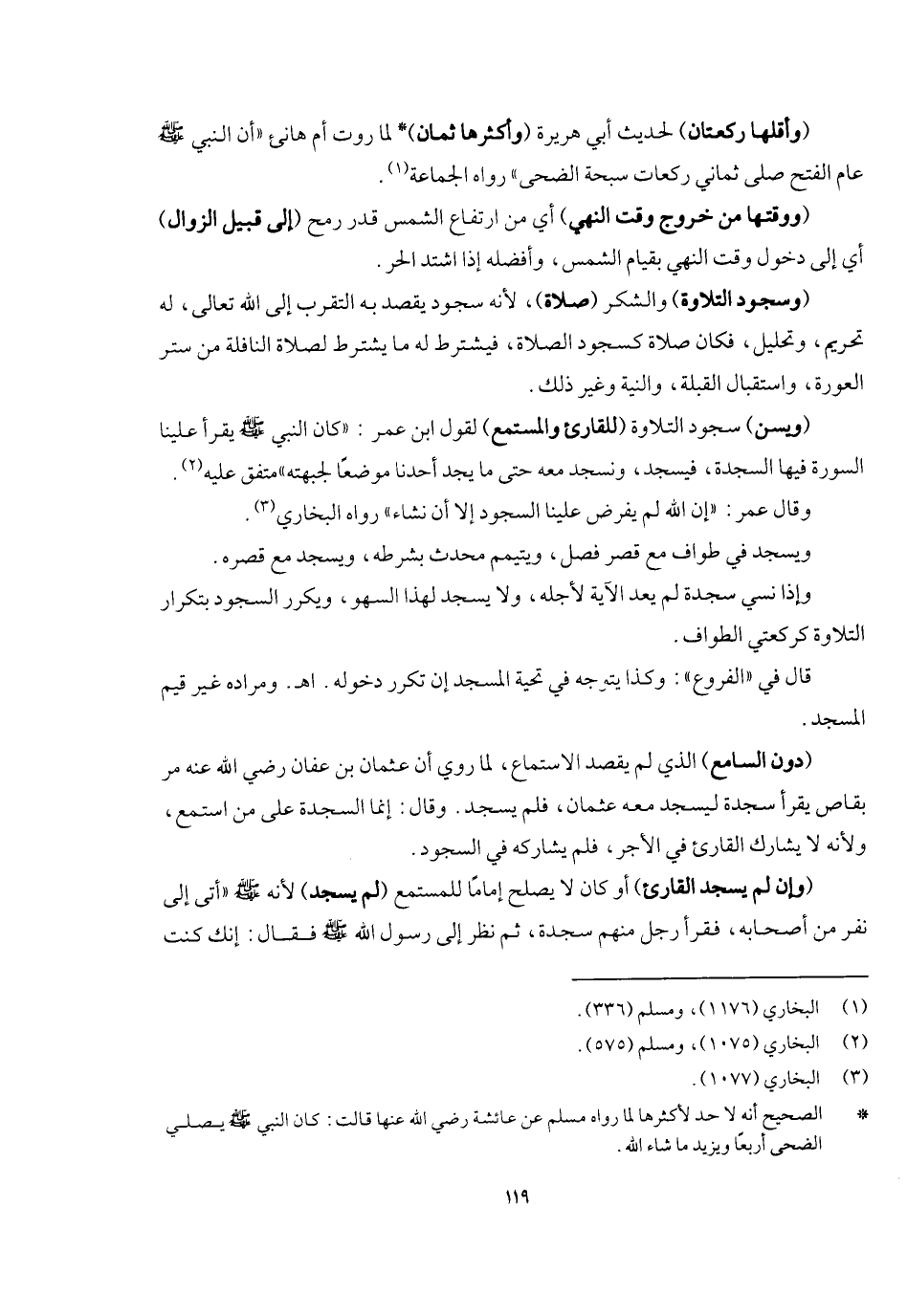 (وسجود التلاوة) والشكر (صلاة) ؛ لأنه سجود يقصد به التقرب إلى الله تعالى له تحريم وتحليل فكان صلاة كسجود الصلاة فيشترط له ما يشترط لصلاة النافلة من ستر العورة واستقبال القبلة والنية وغير ذلك (ويسن) سجود التلاوة (للقارئ والمستمع) لقول ابن عمر: «كان النبي - صَلَّى اللَّهُ عَلَيْهِ وَسَلَّمَ - يقرأ علينا السورة فيها السجدة فيسجد ونسجد معه حتى ما يجد أحدنا موضعا لجبهته» متفق عليه. وقال عمر: «إن الله لم يفرض علينا السجود إلا أن نشاء» ، رواه البخاري، ويسجد في طواف مع قصر فصل ويتيمم محدث بشرطه ويسجد مع قصره، وإذا نسي سجدة لم يعد الآية لأجله ولا يسجد لهذا السهو ويكرر السجود بتكرار التلاوة كركعتي الطواف، قال في " الفروع ": وكذا يتوجه في تحية المسجد إن تكرر دخوله اهـ. ومراده غير قيم المسجد (دون السامع) الذي لم يقصد الاستماع لما روي أن عثمان بن عفان - رَضِيَ اللَّهُ عَنْهُ - مر بقارئ يقرأ سجدة ليسجد معه عثمان فلم يسجد، وقال: إنما السجدة على من استمع ولأنه لا يشارك القارئ في الأجر فلم يشاركه في السجود، (وإن لم يسجد القارئ) ، أو كان لا يصلح إماما للمستمع (لم يسجد) ؛ لأنه - صَلَّى اللَّهُ عَلَيْهِ وَسَلَّمَ - «أتى إلى نفر من أصحابه فقرأ رجل منهم سجدة، ثم نظر إلى رسول الله - صَلَّى اللَّهُ عَلَيْهِ وَسَلَّمَ - فقال: إنك كنت